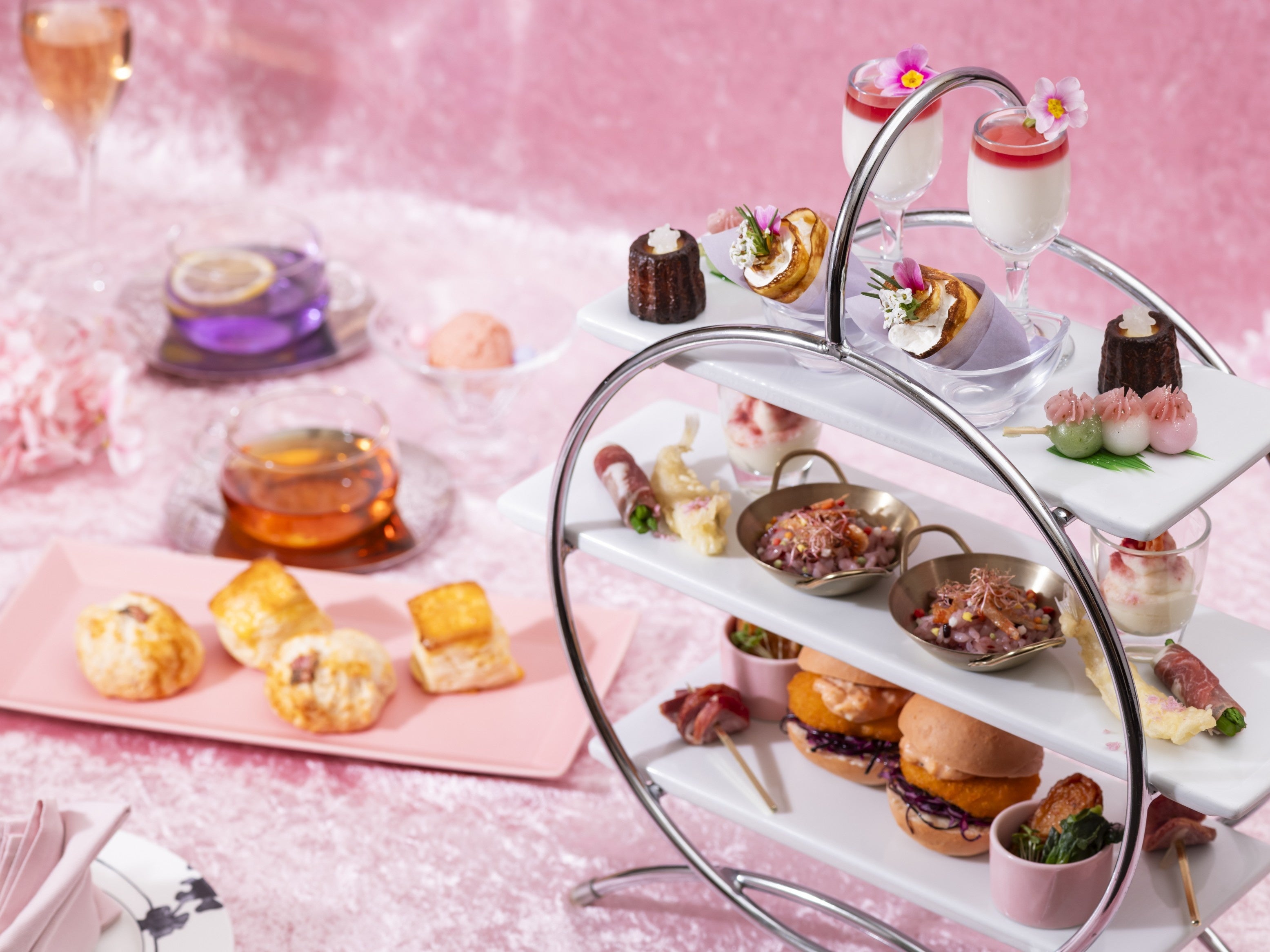 春らしい彩りと軽やかな味わいをテーマに、セイボリーには「キスのベニエ」や「エビカツバーガー」、「豚タンスモークのピンチョス」など、味わいとボリュームのバランスを考えた品々をご用意。「桜エビと黒米のサラダ 五色あられ」や「桜パスタを使ったスナック」も取り入れ、春の食材がテーブルを華やかに彩ります。スイーツには「杏仁豆腐 桜ソース」やカヌレ、和菓子、「ミニクレープのブーケ」など、見た目にも華やかなデザートをラインアップ。桜風味とプレーンの2種類を揃えたスコーンには、世田谷餡子やバター、メイプルシロップを添えてご提供いたします。心弾む春のティータイムを心ゆくまでお愉しみください。