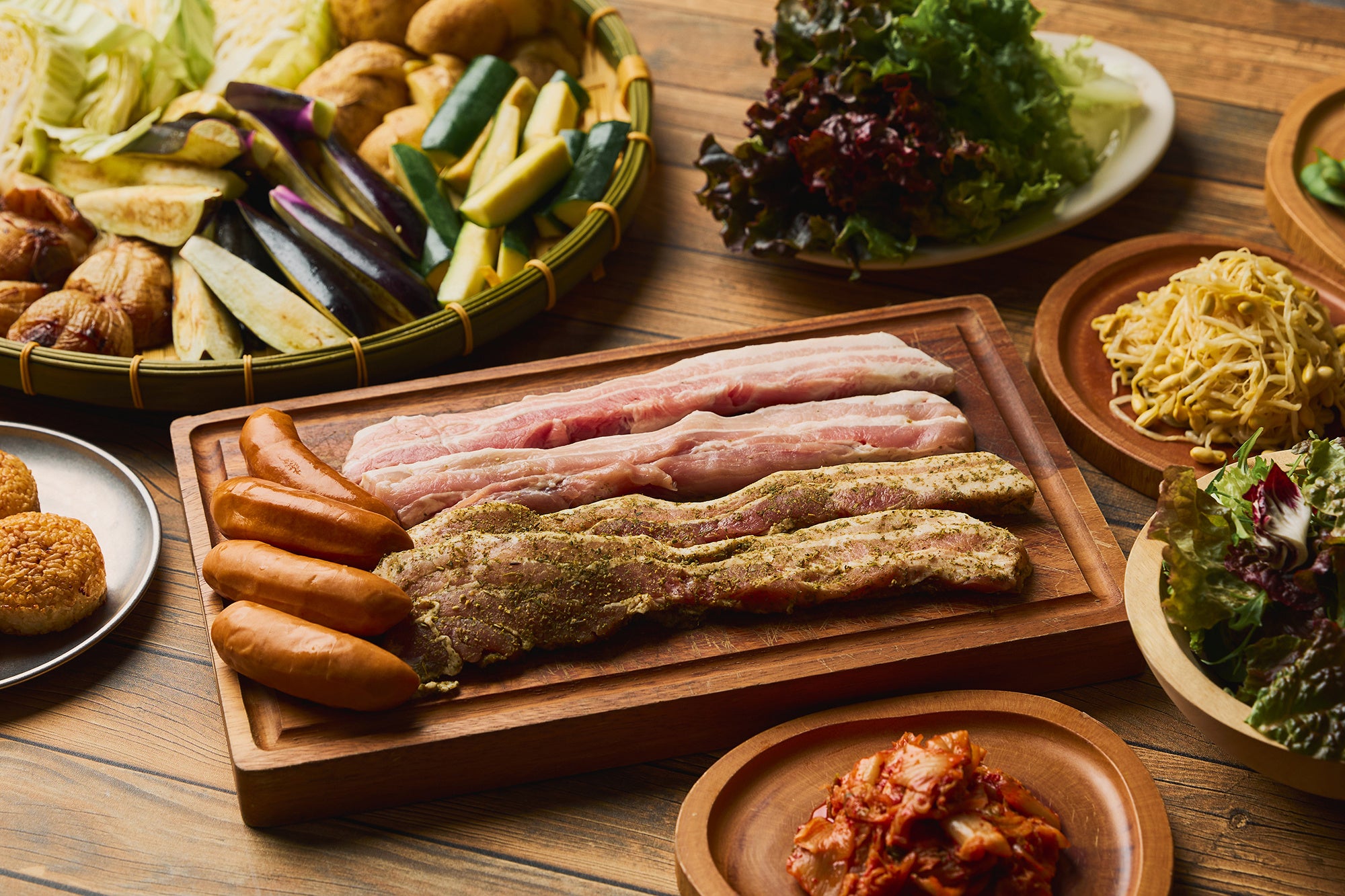 豚バラ肉をプレーンとハーブの2種で楽しむ韓国スタイルのBBQ。焼きおにぎり、枝豆に加え、キムチやナムルもやしなど、箸が止まらない副菜も充実。サラダと焼き野菜は食べ放題。気軽にルーフトップBBQを楽しみたい方におすすめの入門コースです。