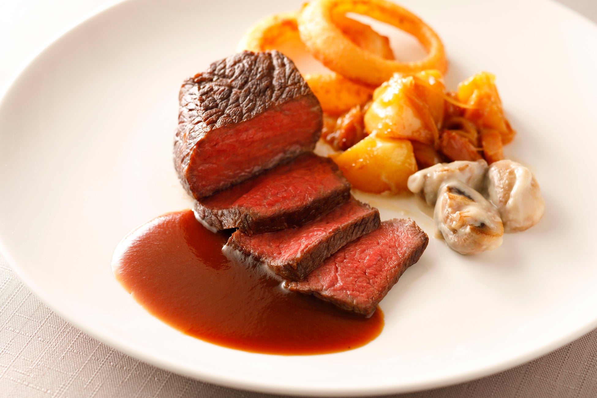 魚料理は、脂ののったノルウェーサーモンをふっくらと焼き上げ、爽やかなハーブとトマトの酸味が広がる濃厚なオランデーズソースで仕上げました。コースの主役には、厳格な基準をクリアした「プライムビーフ」のローストをご用意。丁寧に火を入れ、肉本来の力強い旨みを引き出した逸品です。