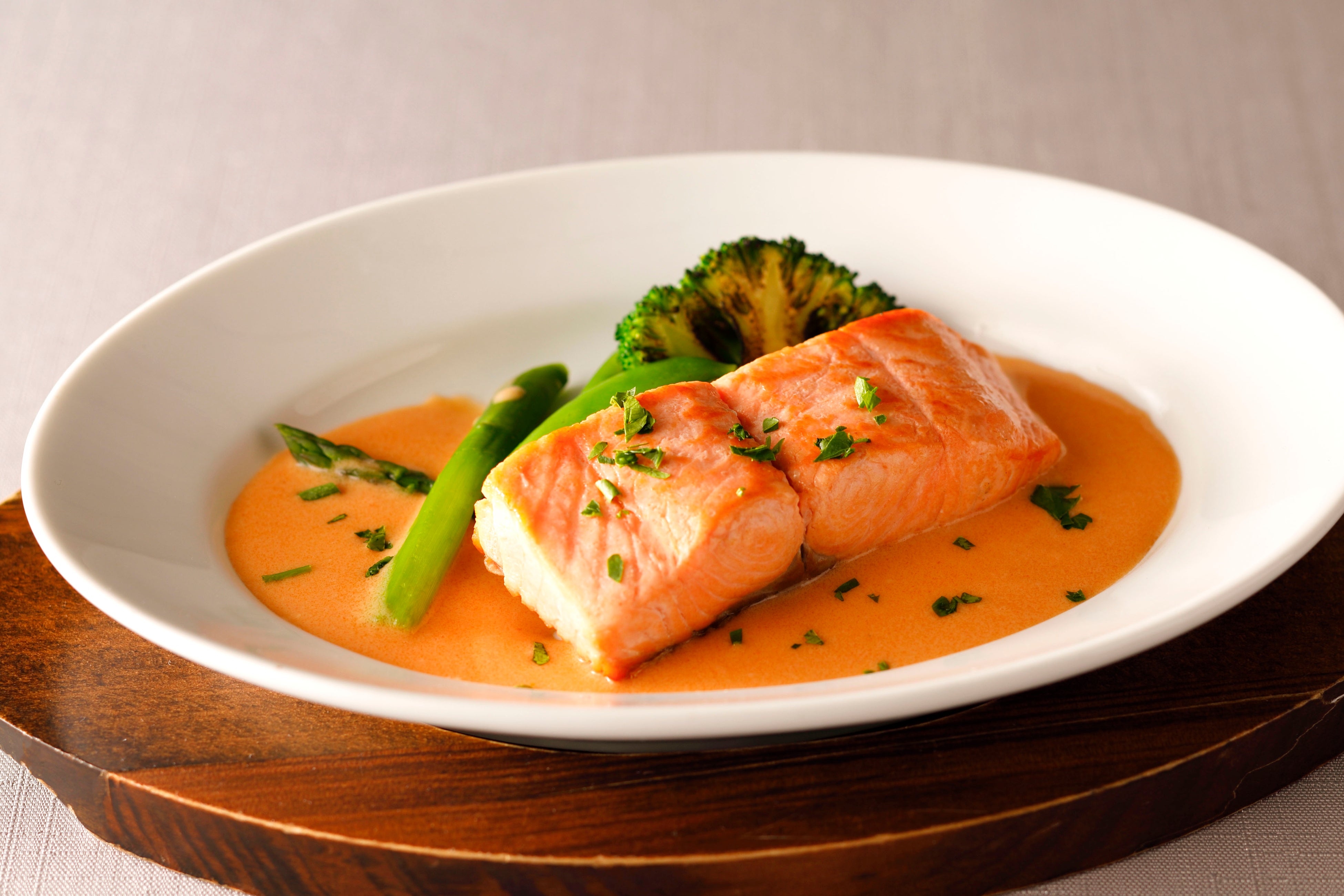 ノルウェーサーモンのオーブン焼き フレッシュハーブとトマトのオランデーズソース