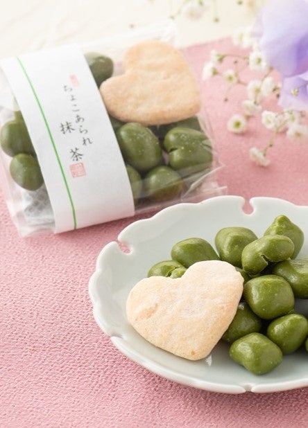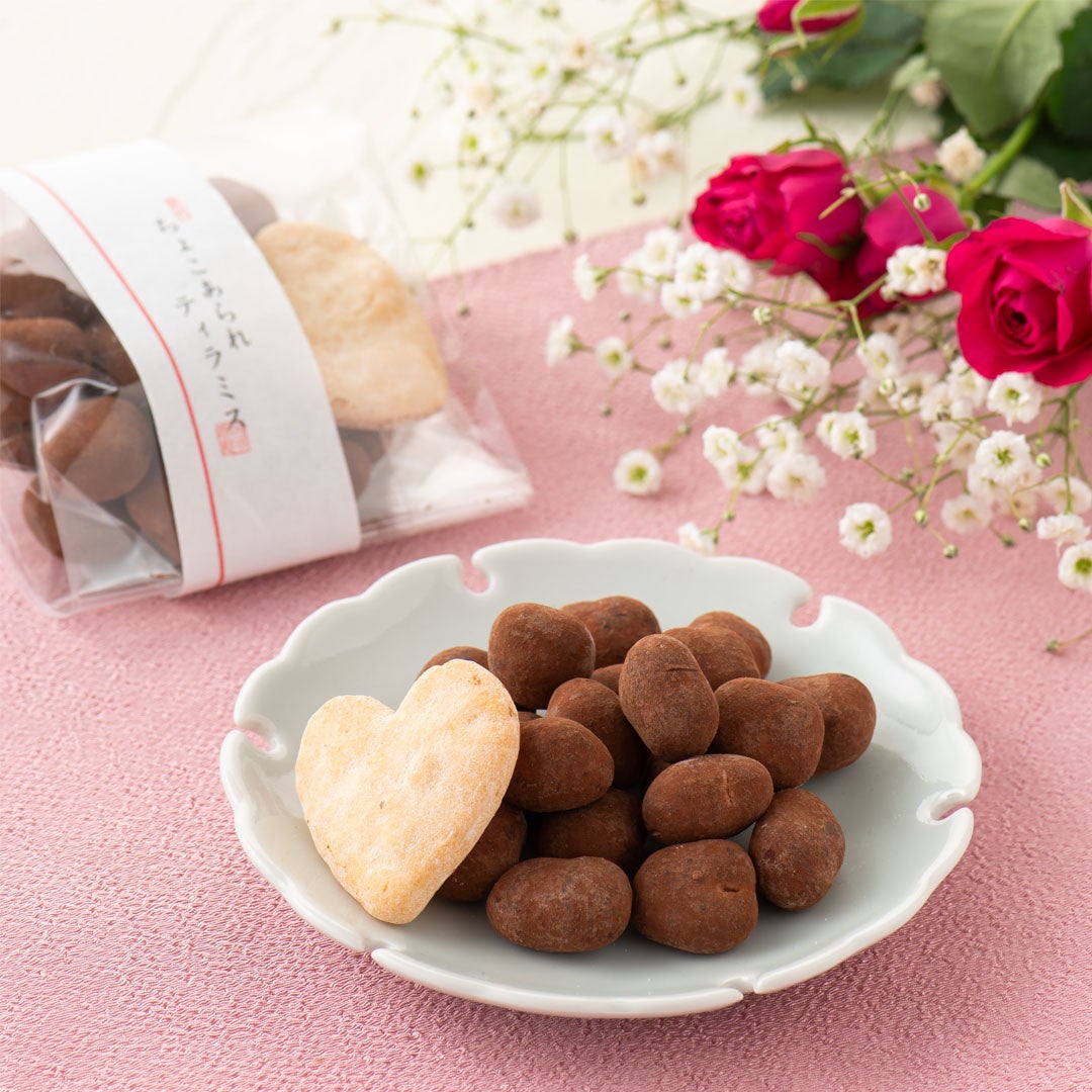 ちょっとしたギフトとしても大人気のチョコあられシリーズ。伝統製法「丸粒蒸し」で炊いた餅を職人の火加減で焼き上げた香ばしい素焼きあられに、チョコをまとわせました。1袋にひとつだけ入っている和三盆味のハート煎餅もかわいらしさを引き立てます。※店舗販売のみの商品です。