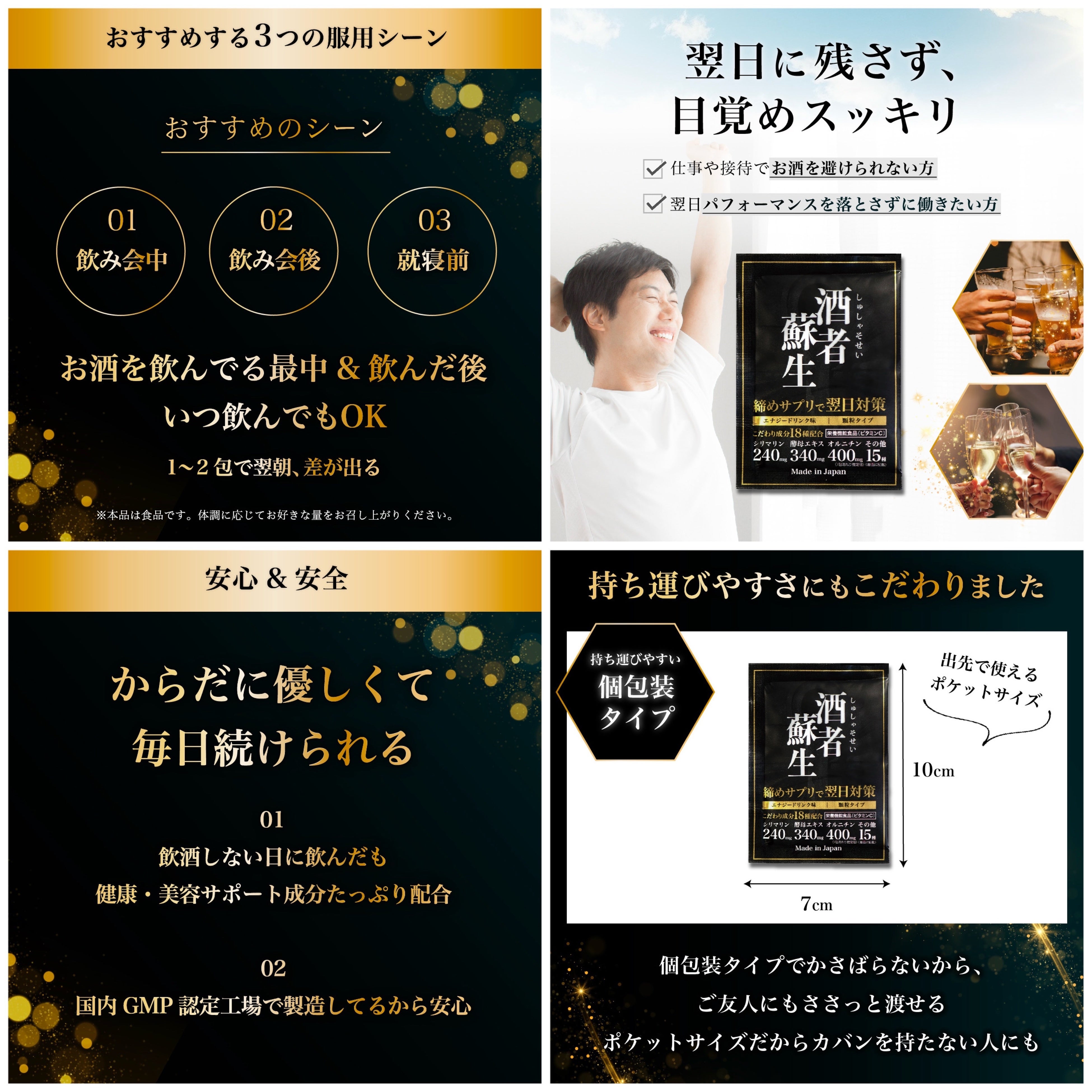 本商品は「明日のあなたを救いたい」というコンセプトのもと開発されたサプリメントです。飲み会の最後に飲むことで翌日のコンディションをサポートする “締めサプリ”という新しい飲酒習慣 を提案します。