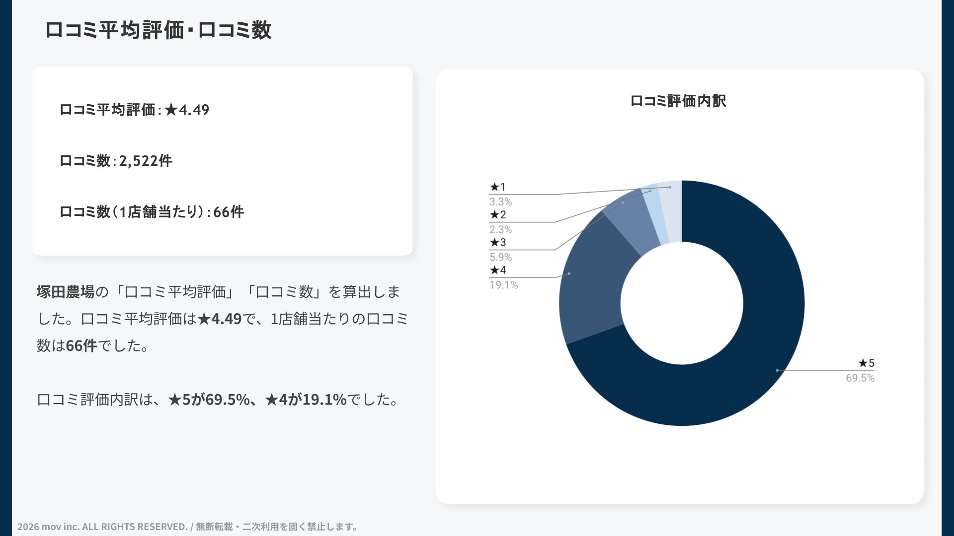 また、口コミ評価内訳は★5が69.5%、★4が19.1%でした。