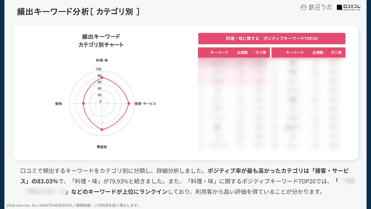 「料理・味」に関するポジティブキーワードTOP20では、「◯◯◯」「◯◯◯◯◯」などのキーワードが上位にランクインしており、お客様からの評価が高いメニューであることがうかがえます。