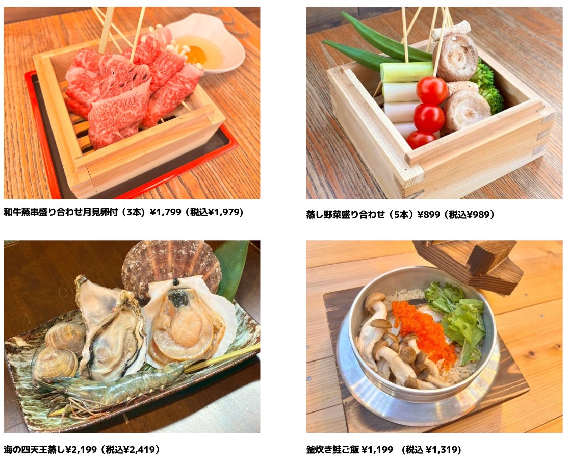 今回のリニューアルでは『蒸串』なる新ジャンルを新たなラインナップに加えました。串もののメニューと言えば、「焼き」や「揚げ」が主流ですが、カイフォルニアでは店舗の根幹でもある【特大蒸し器】を使い、『蒸串』としてご提供します。