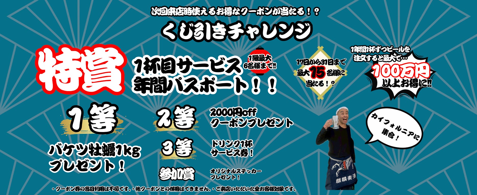 1年間生ビールを1杯サービスで飲み続けると、100万円以上お得に!!もちろん、特賞以外にもお得なサービス券もご用意しておりますので、呑んで食べて更にワクワクを感じながらお愉しみ下さい。