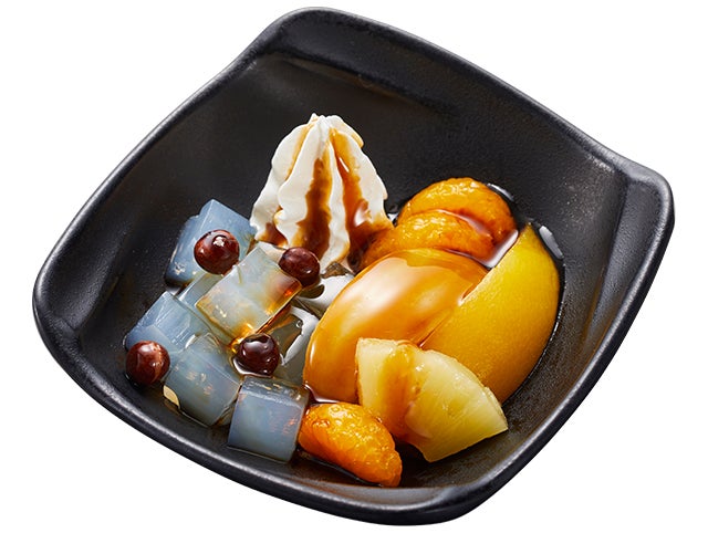 榮太樓の寒天とみつ豆に、かっぱ寿司オリジナルのホイップクリームを添えて、榮太樓の沖縄県産黒糖のコク深い黒みつをかけ、4種の果物を組み合わせました。 寒天の心地よい食感と、黒みつの上品な香り・深いコクに、4種の果物が彩りと甘みを添える食後にもぴったりの一品です。