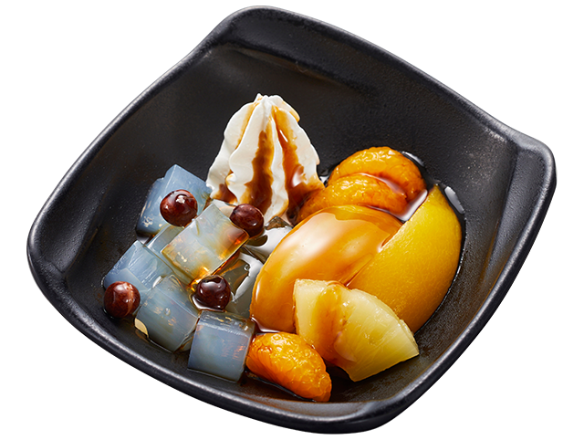 榮太樓の寒天とみつ豆に、かっぱ寿司オリジナルのホイップクリームを添えて、榮太樓の沖縄県産黒糖のコク深い黒みつをかけ、4種の果物を組み合わせました。 寒天の心地よい食感と、黒みつの上品な香り・深いコクに、4種の果物が彩りと甘みを添える食後にもぴったりの一品です。