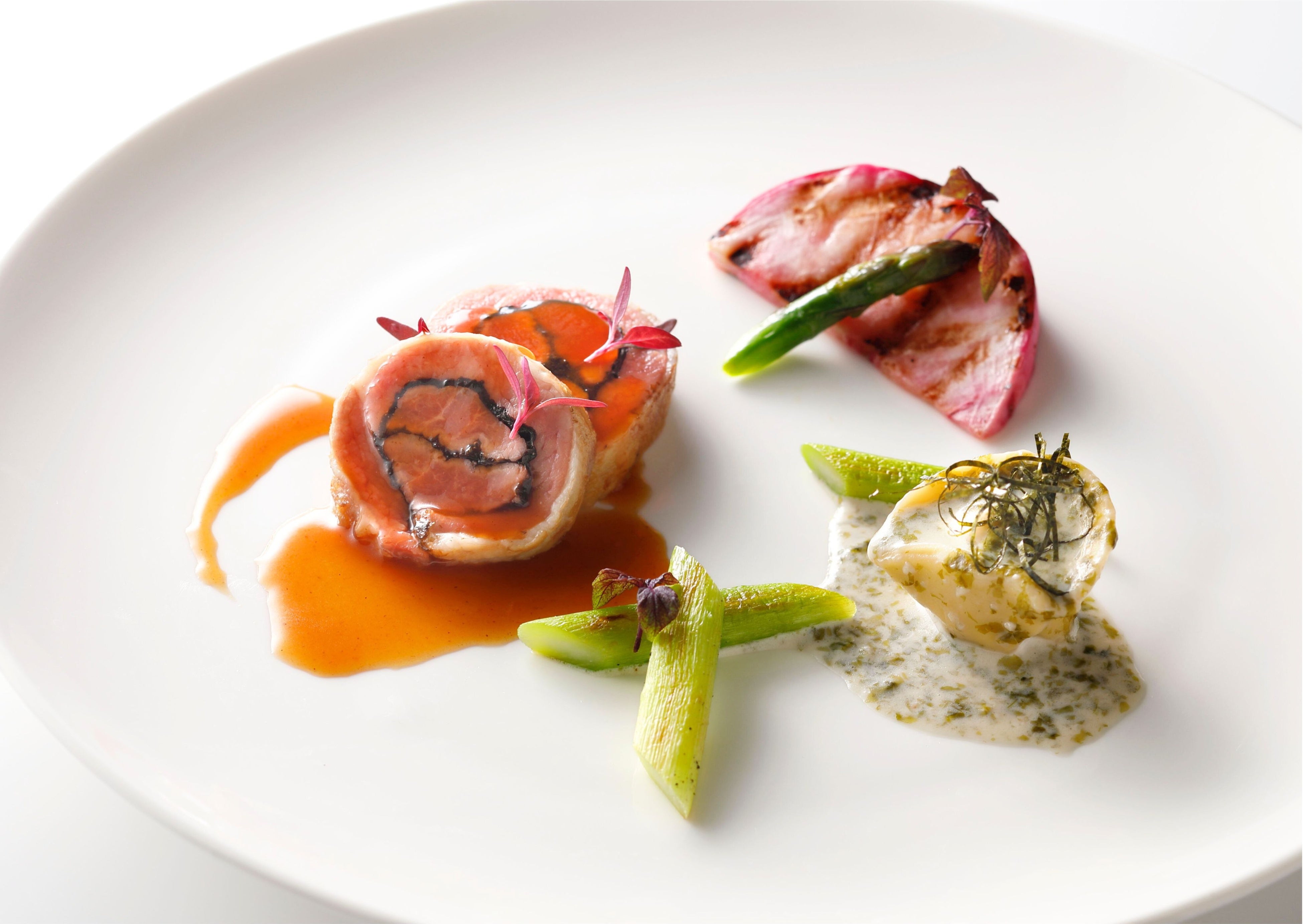 仔羊のロインと肩肉を用い、「江戸前ちば海苔」の香りとミネラル感を重ねた一皿。ロインには生海苔を忍ばせ、板海苔とバラ肉で包み込んで香ばしくローストすることで、仔羊の繊細な旨味と海苔の磯の香りが調和する味わいに仕立てました。さらに肩肉は、香辛料と香味野菜とともにじっくりと煮込み、手打ちのラビオリに。仕上げに生海苔を加えたクリームソースを合わせることで、仔羊のコクに海のミネラルが寄り添う、奥行きのある味わいを表現しています。