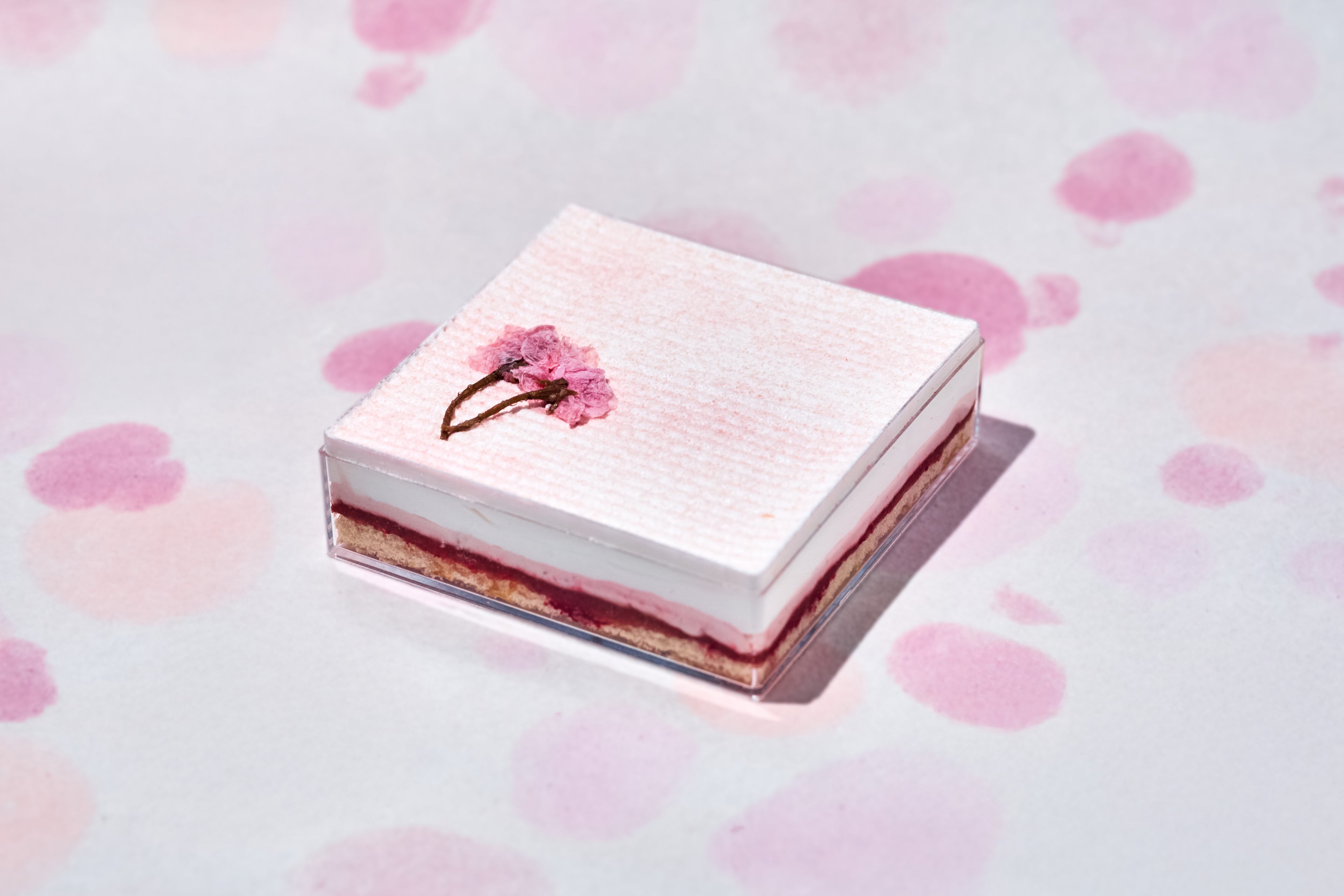 春の訪れを告げる桜の折菓子。日本の春を象徴する桜の美しさを、味わいと装いに重ねました。桜がふわりと香る軽やかな生地に、甘酸っぱいあまおう苺のジャム、なめらかな桜餡のクリームを重ねて。中にはパリッと軽やかなホワイトチョコレートを忍ばせ、食感のアクセントにしました。咲き誇る桜の花びらをあしらった、優しく華やかな春限定の折菓子です。