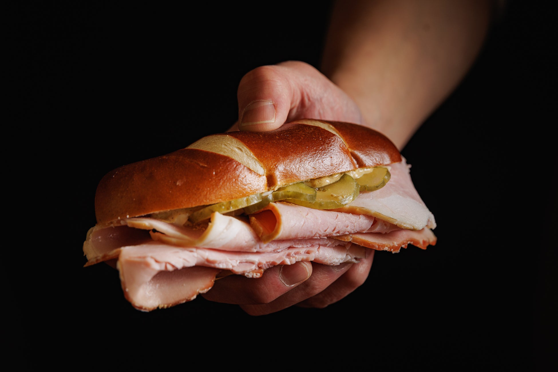 自社工房で職人が丁寧に焼き上げた、香ばしく歯切れの良いプレッツェルロールに、主役のハムをたっぷりサンド。一口頬張るとスモークの豊かな香りが口いっぱいに広がり、噛みしめるほどに肉の凝縮した旨みとプレッツェルならではの食感が重なり合い、シンプルながら食べ応えのある一品です。