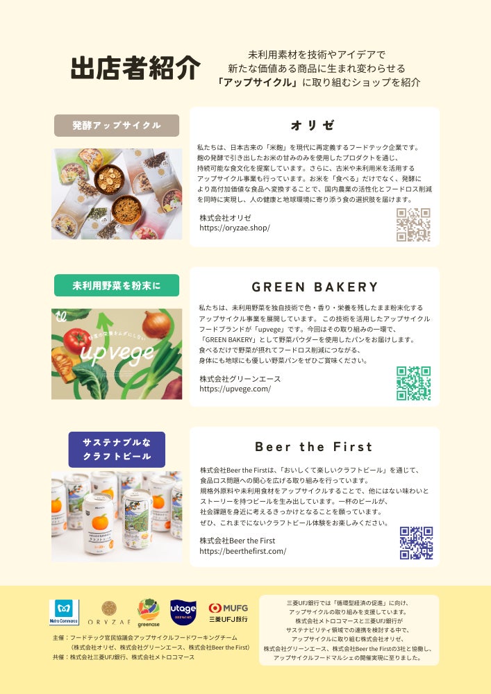 こうした背景を受け、東京メトログループと三菱UFJ銀行がサステナビリティ領域での新たな連携を模索する中で、駅構内の催事スペースに着目した本企画が立案されました。三菱UFJ銀行の呼びかけにより、独自の技術を持つスタートアップ3社(オリゼ、グリーンエース、Beer the First)が賛同し、今回の共同出店が実現。 なお、参加スタートアップ3社と三菱UFJ銀行は、フードテック官民協議会の「アップサイクルフードワーキングチーム」にも参画しており、本取り組みは同施策とも連動しています。