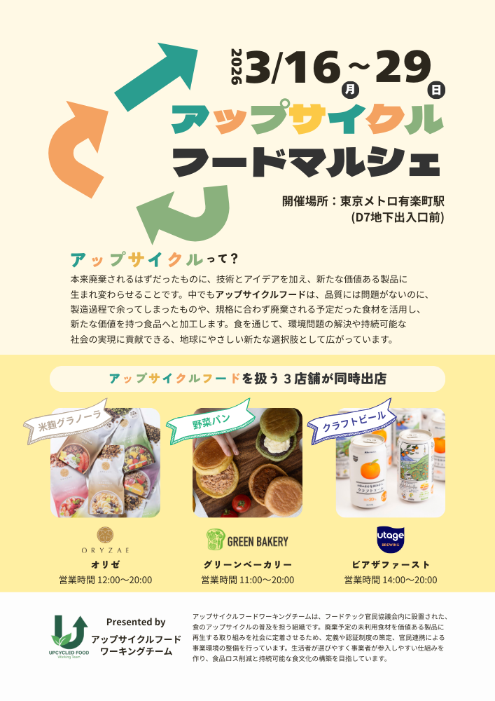 独自の粉末化技術を用いて、未利用野菜のアップサイクルに取り組む株式会社グリーンエース(本社:山形県酒田市、代表取締役:中村慎之祐、以下「グリーンエース」)は、株式会社メトロコマース、株式会社三菱UFJ銀行、株式会社オリゼ、株式会社Beer the Firstと協働し、食の「アップサイクル」普及に向けた取り組みとして、2026年3月16日(月)から3月29日(日)まで、東京メトロ有楽町駅にて期間限定ショップ『アップサイクルフードマルシェ』を開催いたします。