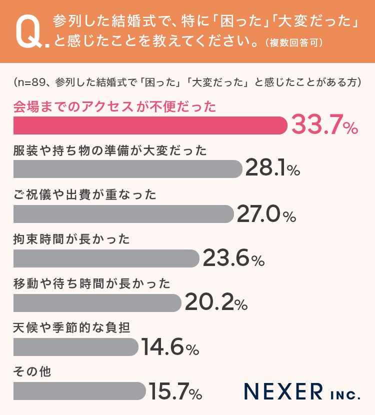 もっとも多かったのは「会場までのアクセスが不便だった」で33.7%でした。次いで「服装や持ち物の準備が大変だった」が28.1%、「ご祝儀や出費が重なった」が27.0%、「拘束時間が長かった」が23.6%と続いています。