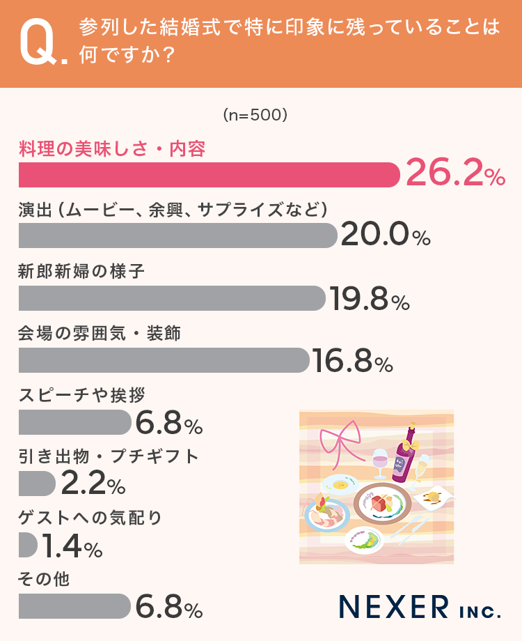 今回の調査では、参列した結婚式で一番印象に残ったものとして「料理」をあげた方が多く、参列者の記憶には食事の体験が強く残りやすいことがわかりました。