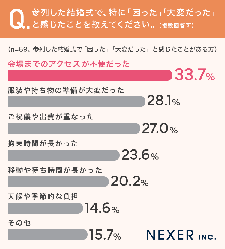 もっとも多かったのは「会場までのアクセスが不便だった」で33.7%でした。次いで「服装や持ち物の準備が大変だった」が28.1%、「ご祝儀や出費が重なった」が27.0%、「拘束時間が長かった」が23.6%と続いています。