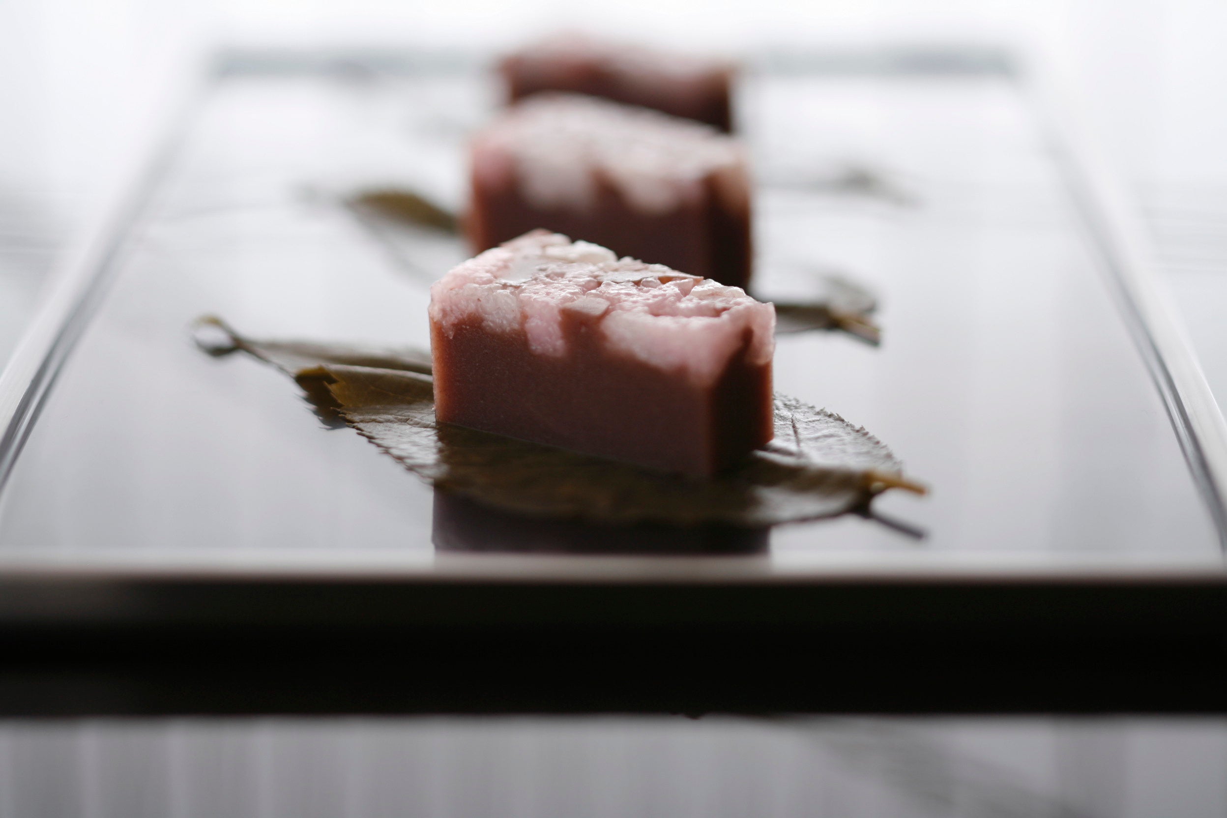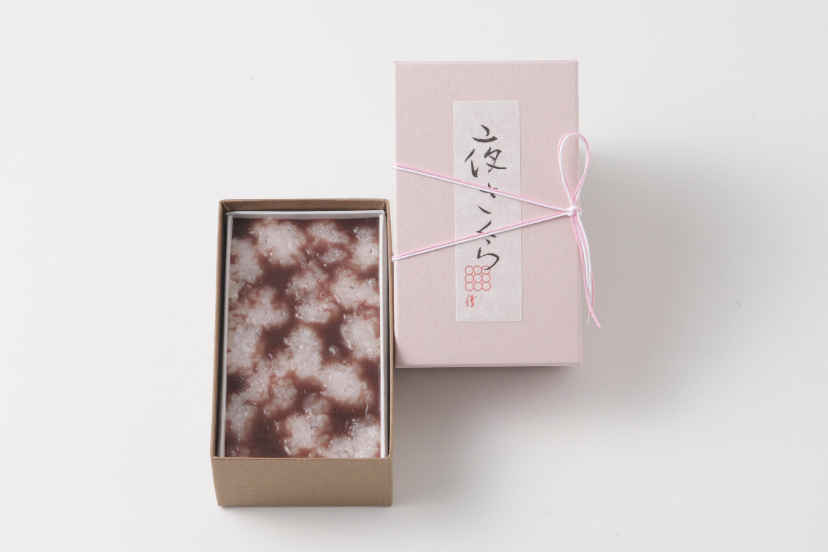 じっくり炊き上げた国産小豆の水羊羹に、ほんのり桜色に染めた道明寺を散りばめました。別添えの桜葉を添えることで、香りがより引き立ちます。