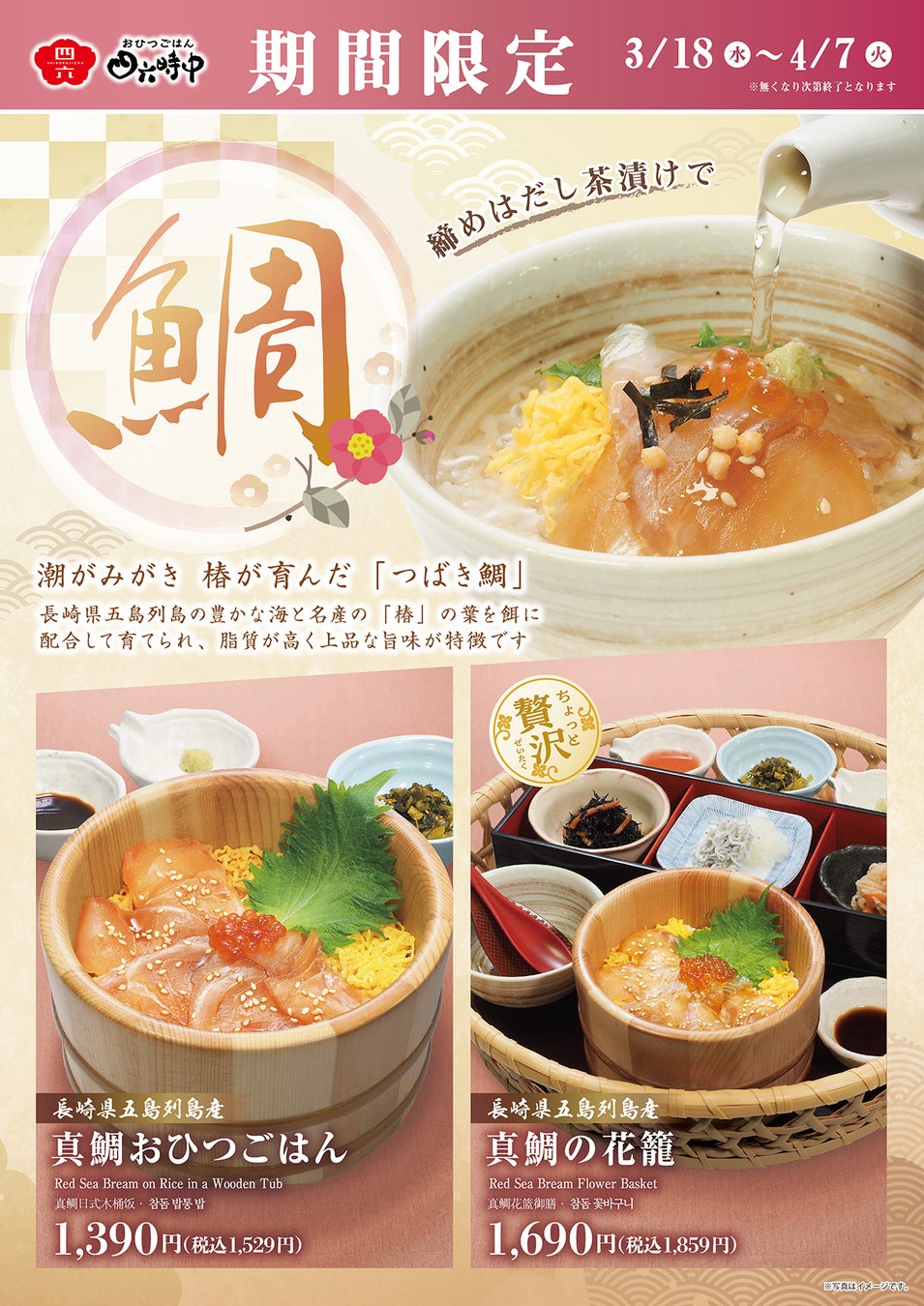 日本最大のだし茶漬け専門チェーン 『おひつごはん四六時中』(以下、当店)では、長崎県五島列島産の真鯛を使用した季節限定商品2品を3月18日より販売いたします。