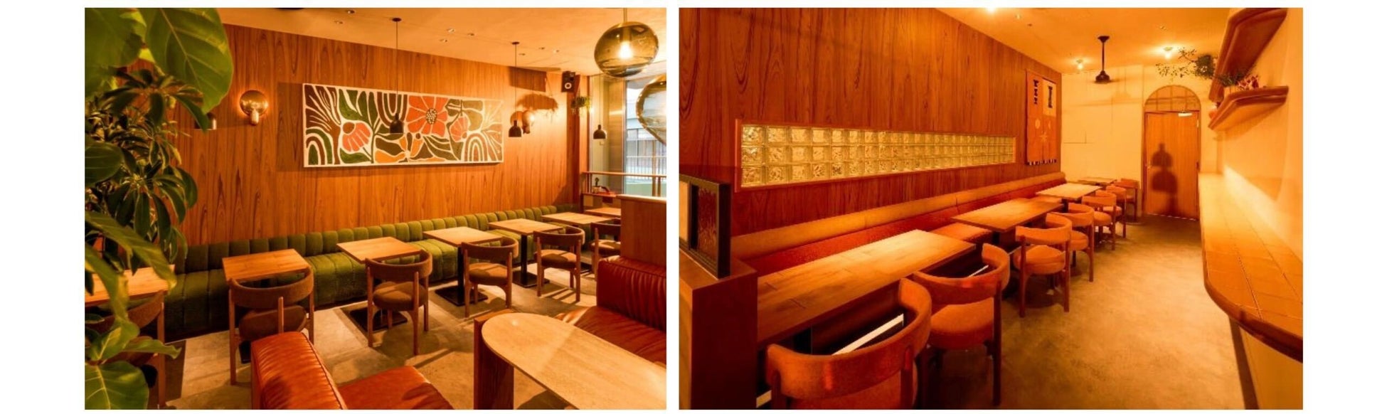 店内はブラウンのウッド材を基調に、緑や茶色、オレンジ、白など、ハワイのサンセットや自然の風景を思わせる温かみのある配色の家具をアクセントとして配置。木のぬくもりがもたらす落ち着きと、夕暮れのようなやさしい色合いが重なり合い、自然と肩の力が抜ける心地よい空間を演出しています。