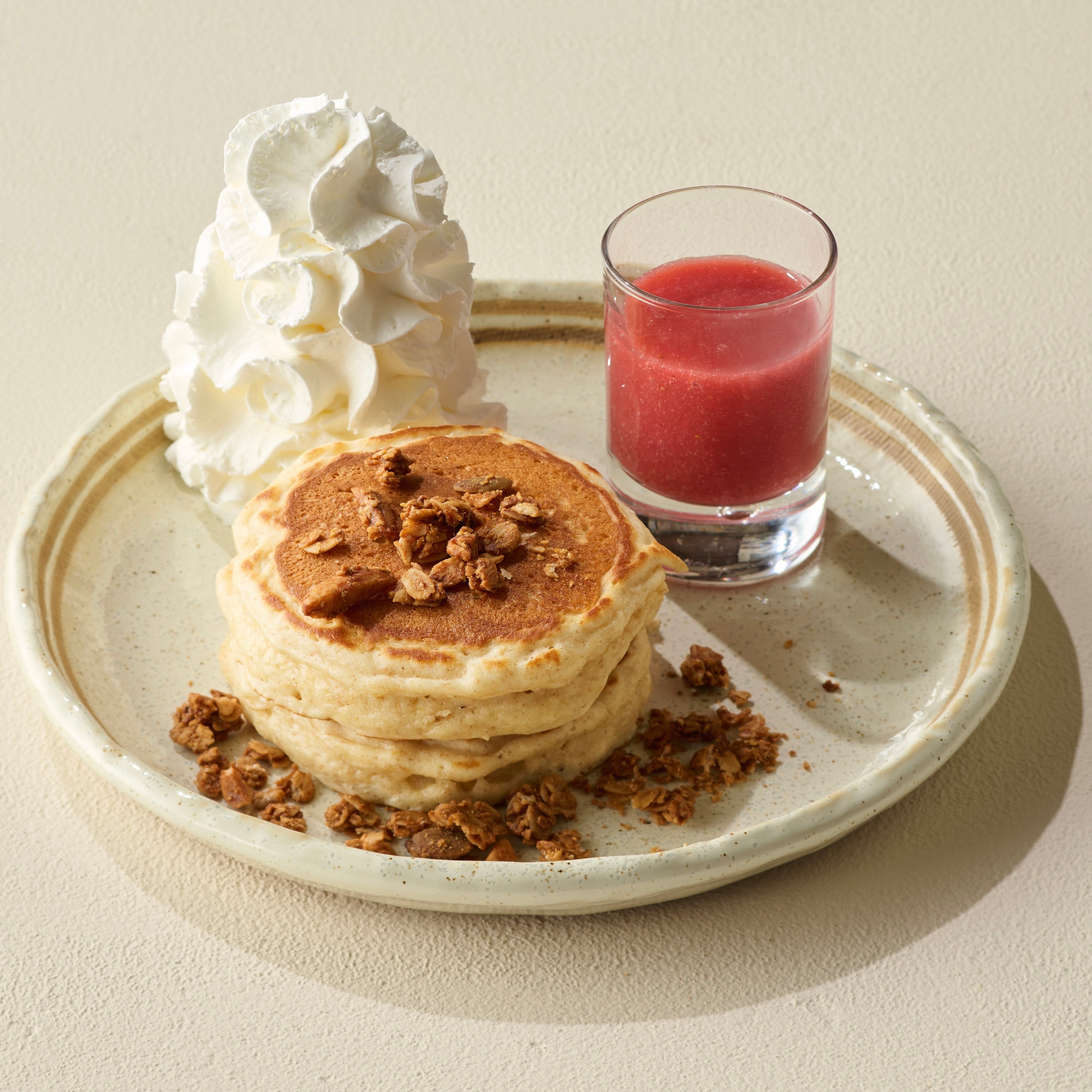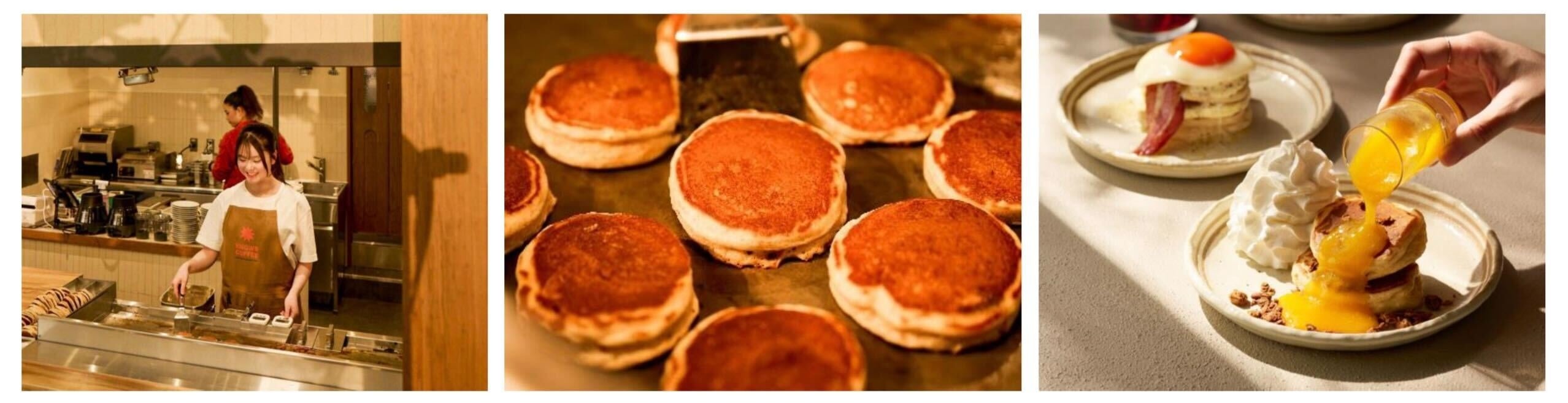 店内には、パンケーキが一枚ずつ丁寧に焼き上がる様子を目の前で楽しむことができる、ライブ感たっぷりな「パンケーキバー」をご用意。鉄板の上で生地がふわっとふくらみ、焼き色がついていく音、香ばしい香りが広がるライブ感と、できたてのパンケーキが味わえます。パンケーキは一枚から注文可能。素材の味をシンプルに楽しむのはもちろん、ベーコンに目玉焼き、ホイップクリームにチョコレートソースなど、お好みのトッピングとの組み合わせもおすすめです。さらに、目の前でバーナーを使って仕上げるトリュフバターパンケーキやブリュレパンケーキなど、多彩なメニューをご用意しています。