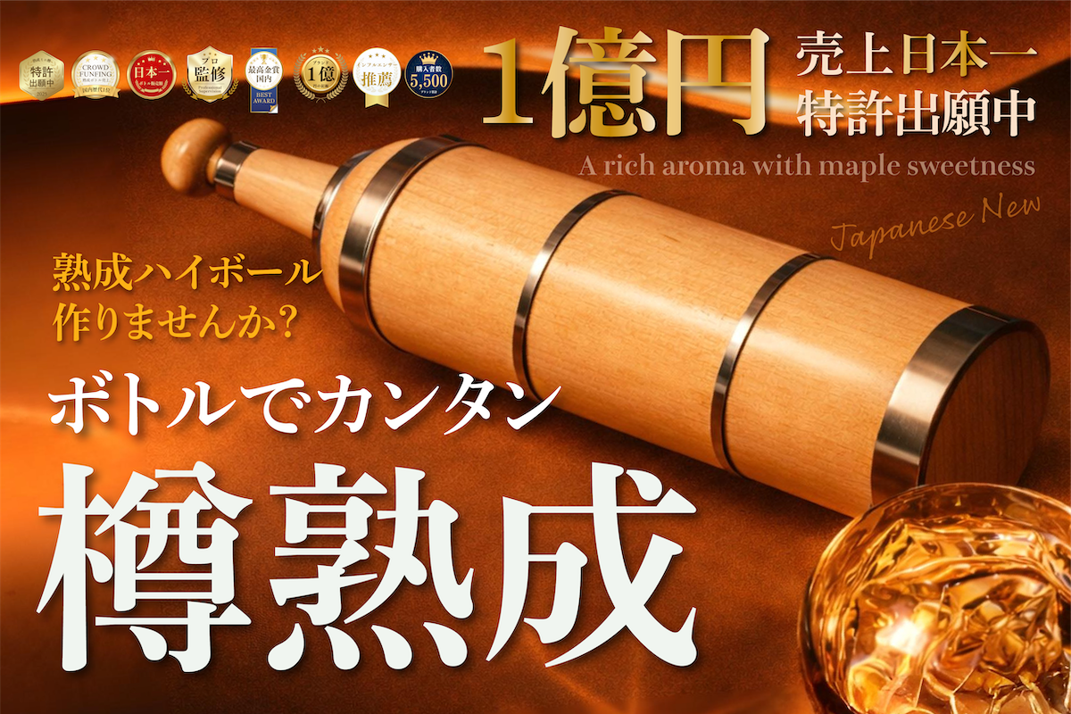 山梨県発のハイボール専用ブランド「MAGIC BARREL」が、特許出願中「メープル製の熟成ボトル」を新しく新発売。熟成されたウイスキーで作る『熟成ハイボール』を山梨から全国へ。開始から600人の支援