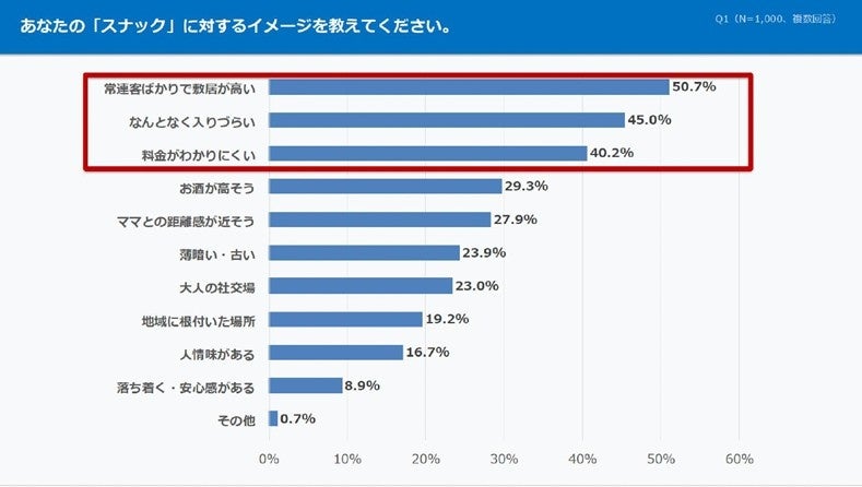 スナックに対するイメージは、過半数の50.7%が『常連客ばかりで敷居が高い』と回答し、45.0%が『なんとなく入りづらい』、40.2%が『料金がわかりにくい』と感じていることがわかりました。