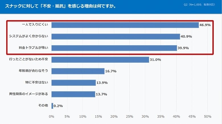 さらに、「不安・抵抗感」を感じる理由について具体的に問うと、46.9%が『一人で入りにくい』と感じており 、40.9%が『システムがよく分からない』 、39.9%が『料金トラブルが怖い』と回答。