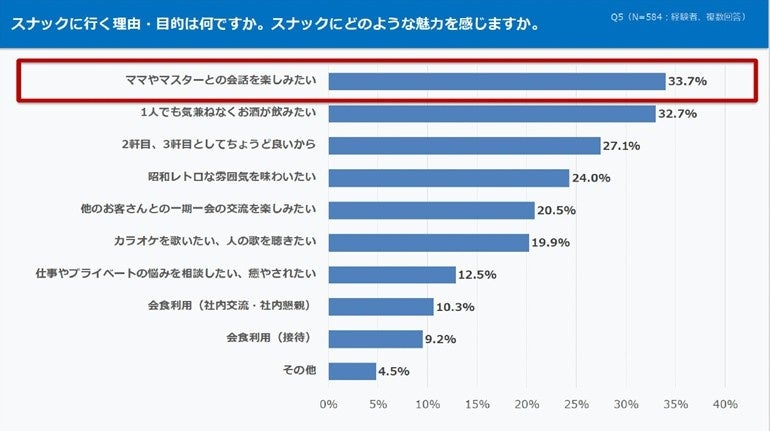 スナック経験者にスナックに行く理由・目的を聞いてみると、1位は『ママやマスターとの会話を楽しみたい(33.7%)』となりました。ママやマスターとのコミュニケーションは、他の飲食店舗では味わえない「第三者とのコミュニケーションができる場」であり、スナックを経験層が感じるスナックの魅力であることが判明しました。