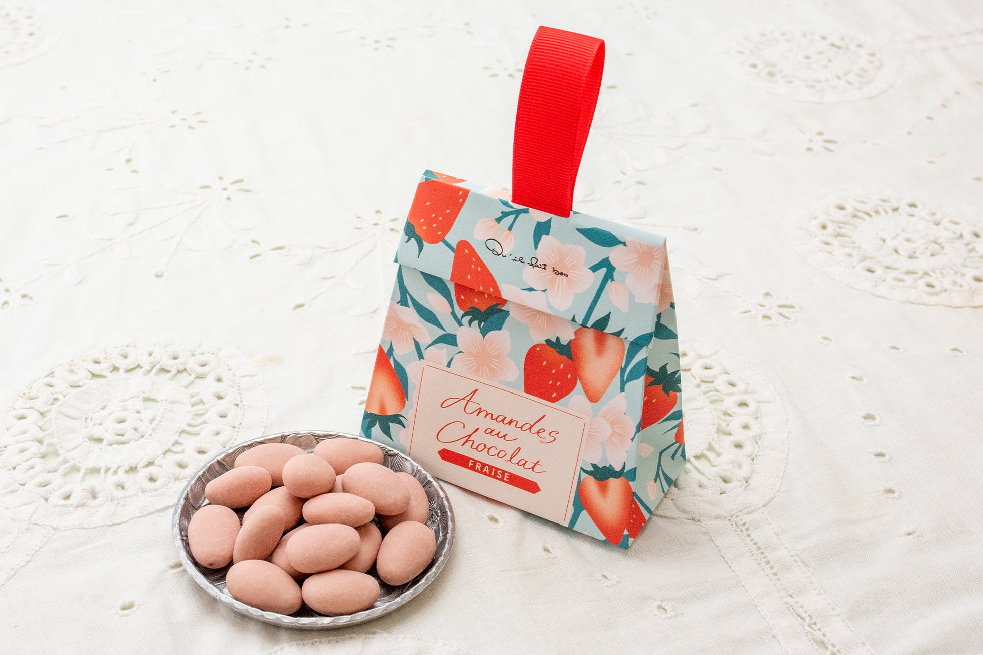 アーモンドをホワイトチョコでくるみ、仕上げにあまおうパウダーをまぶしました。丸ごと入ったナッツの食感がアクセントになった美味しいチョコレートです。