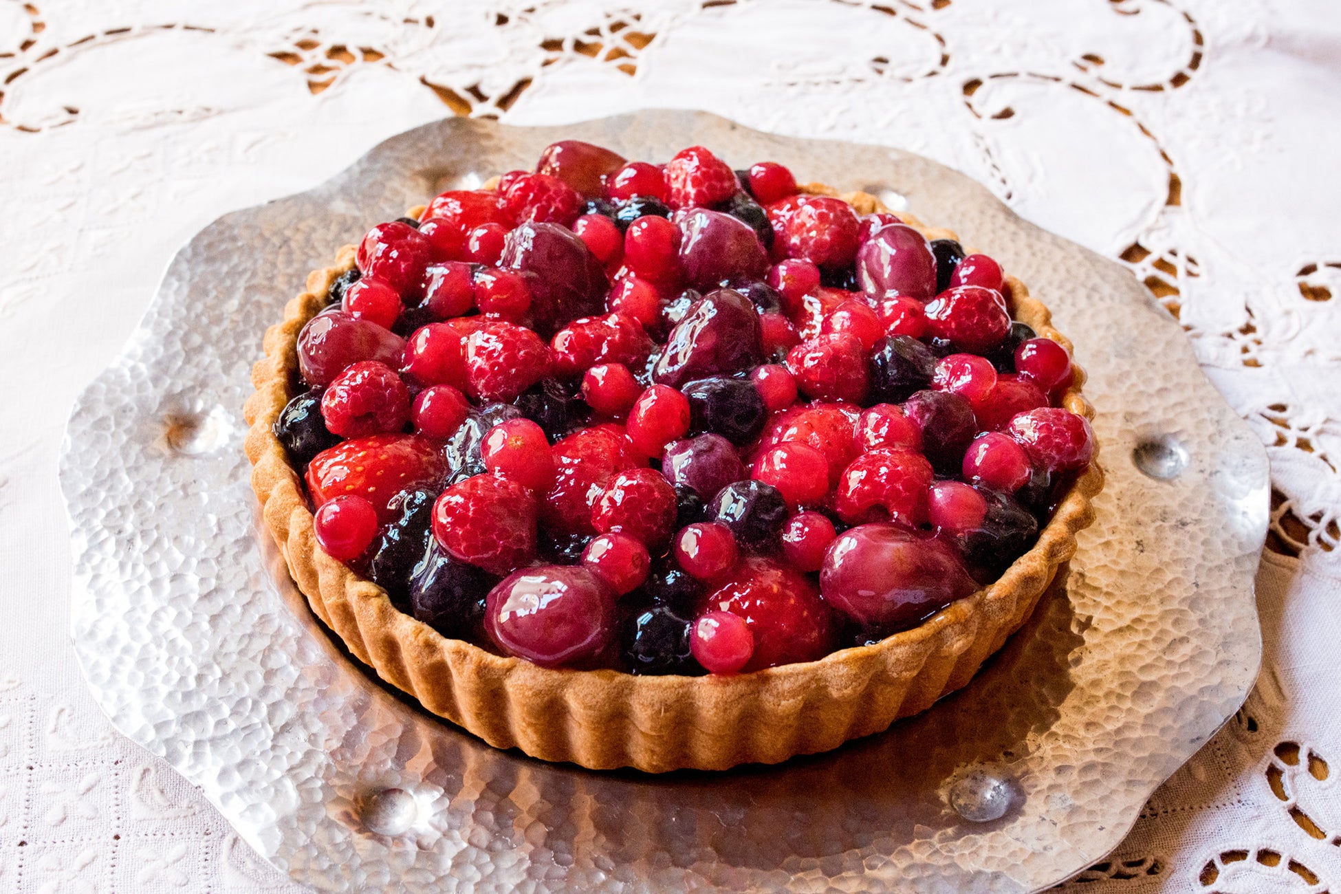 イチゴをはじめ数種のベリーやぶどうなど、甘酸っぱいフルーツをたっぷりと飾った華やかなタルトです。爽やかな酸味とまろやかなコクのサワークリームをたっぷりと使用し、仕上げにシナモンを振った風味豊かなタルトと組み合わせました