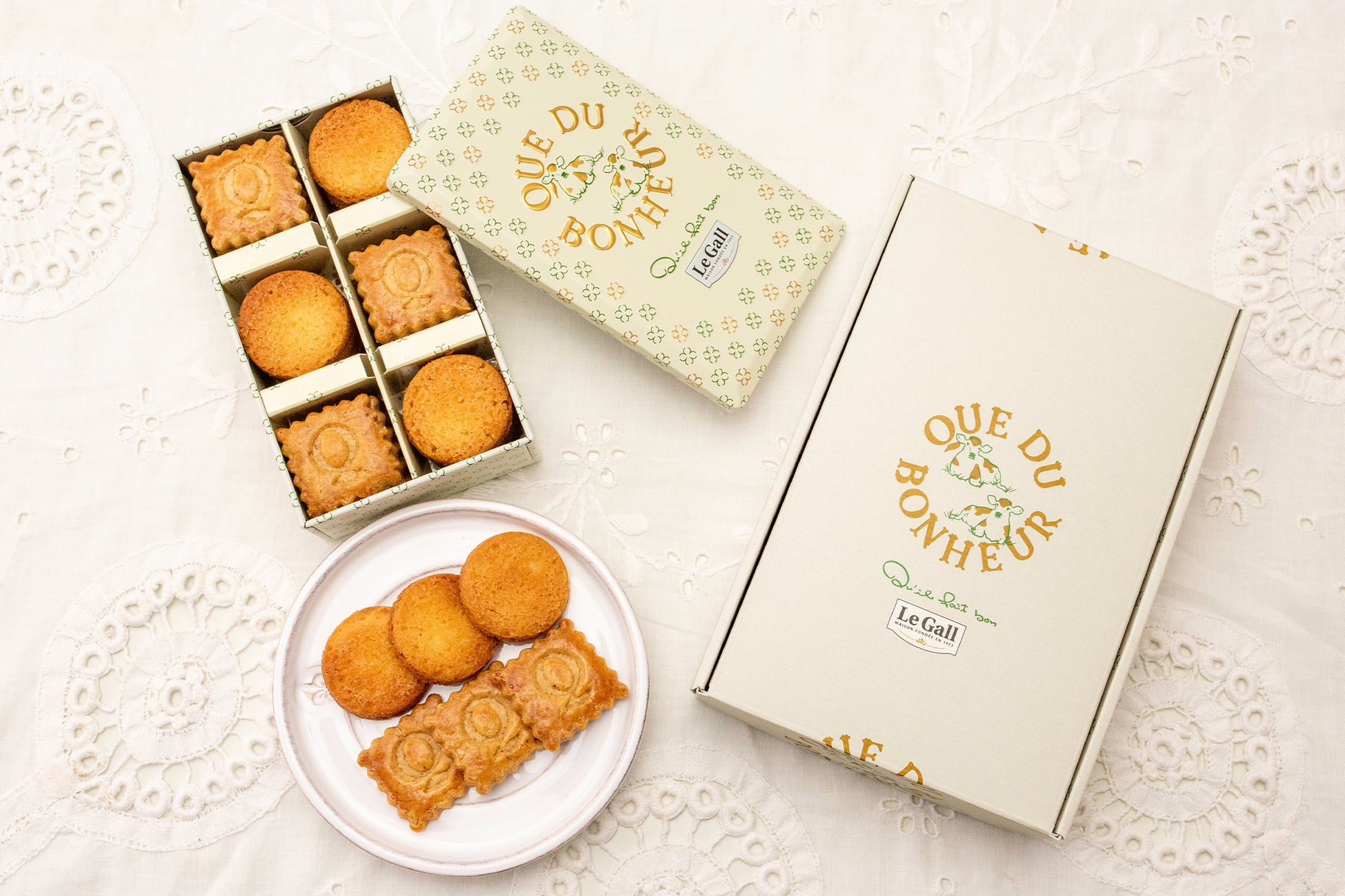 フランス“ル ガール”の前発酵バター、良質なフランス産小麦 100%の小麦粉、ゲランドの塩など、選りすぐりの材料を贅沢に使用し、ほろっとした食感の“ガレット”と、サクサクとした食感の“サブレ”を焼き上げました。「ク ドゥ ボナール」でしか味わえない豊かなコクと、香りの余韻をご堪能ください。