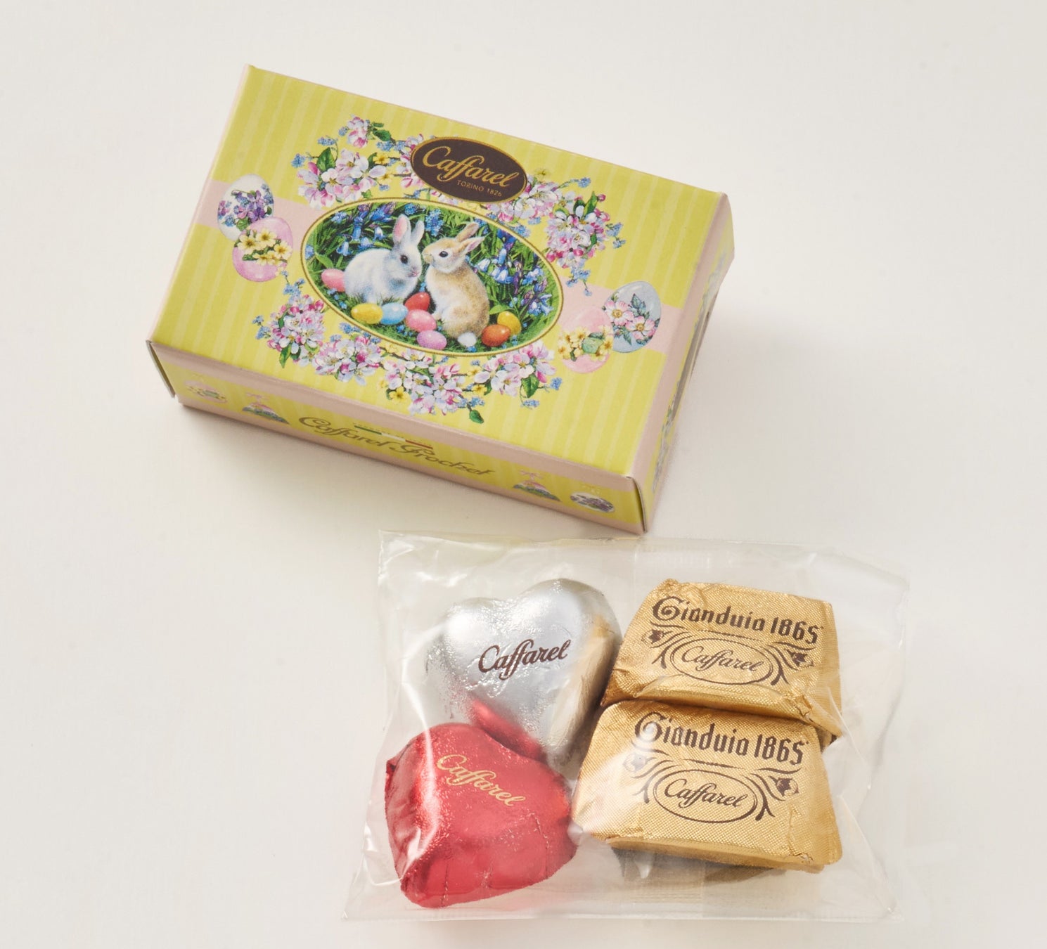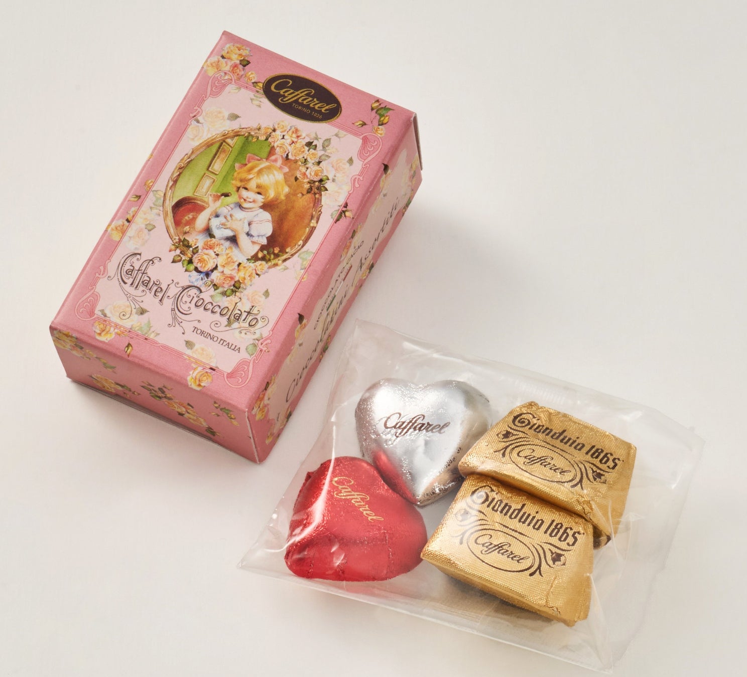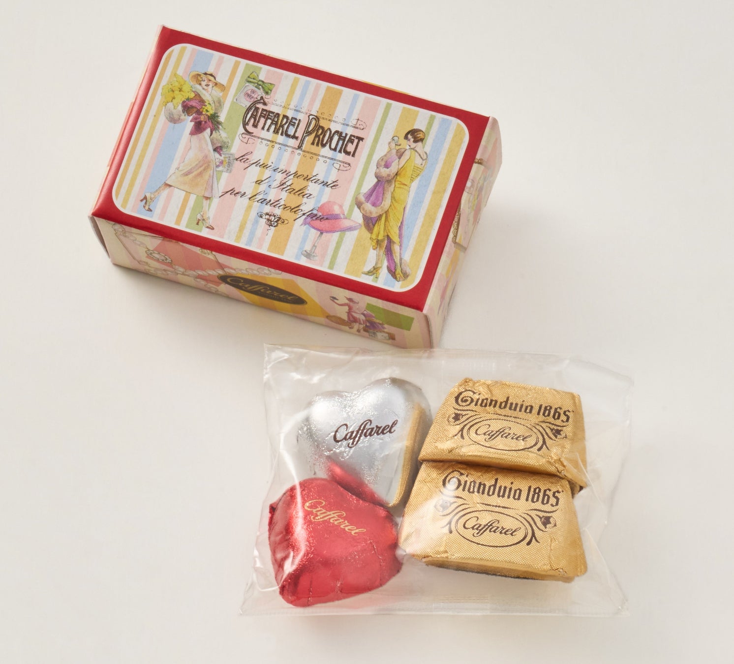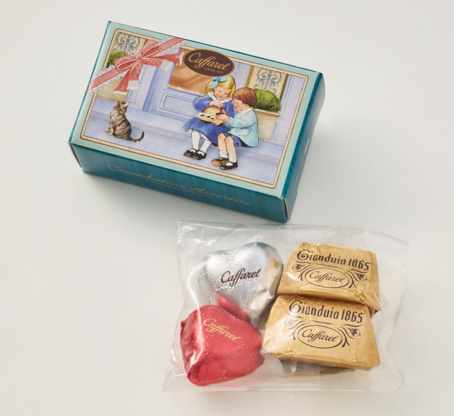 ・商品説明:カファレル人気のイラストが描かれた、選ぶ楽しさいっぱいのプチボックス。全部でデザインは9種類。中にはミニジャンドゥーヤ2粒、ミニハート1粒、ミニハートダーク1粒、計4粒をアソート。