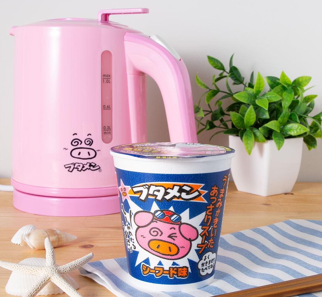 必要な量のお湯を素早く沸かすことができる電気ケトルは、ミニカップサイズのブタメンを楽しむのにもピッタリ!コードレスで電源スタンドから持ち上げれば、コードがからまずに安全にお湯が注げます。ブタメンくんの可愛いプリント入りのブタメンオリジナル電子ケトルは、キッチンやお部屋のアクセントにも。さぁ、ブタメンを買って食べて応募しよう!