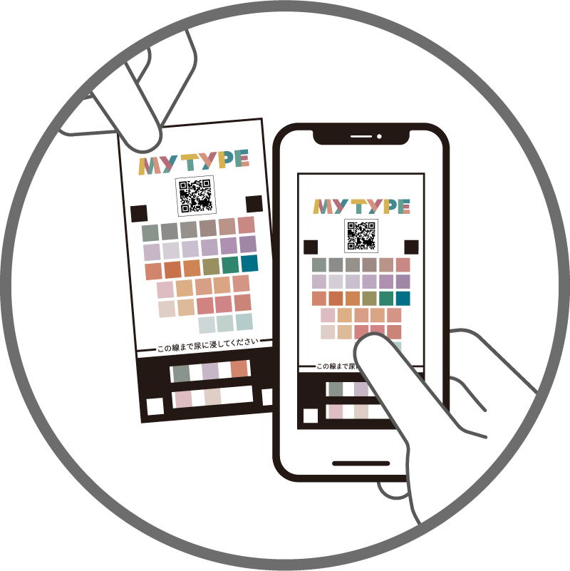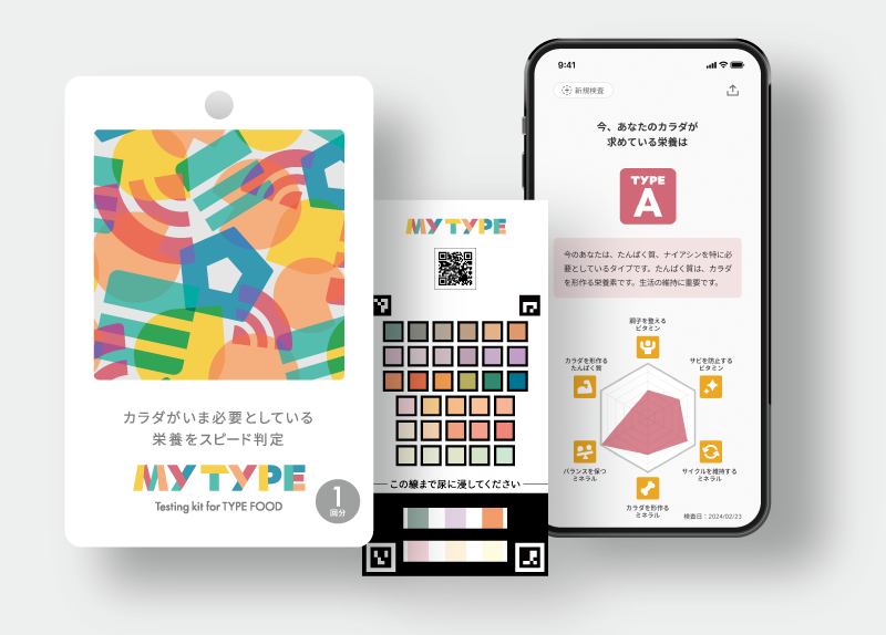 簡易尿検査キット「MY TYPE」と専用のアプリを連動させることで、「栄養タイプ」と「栄養バランス」を約1分で判定します。