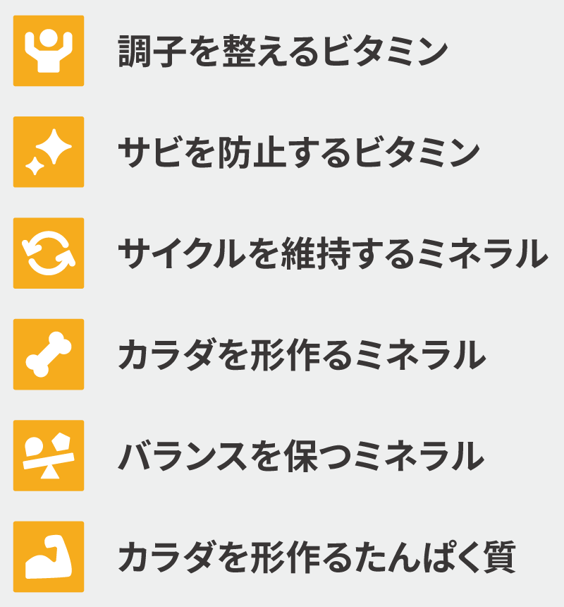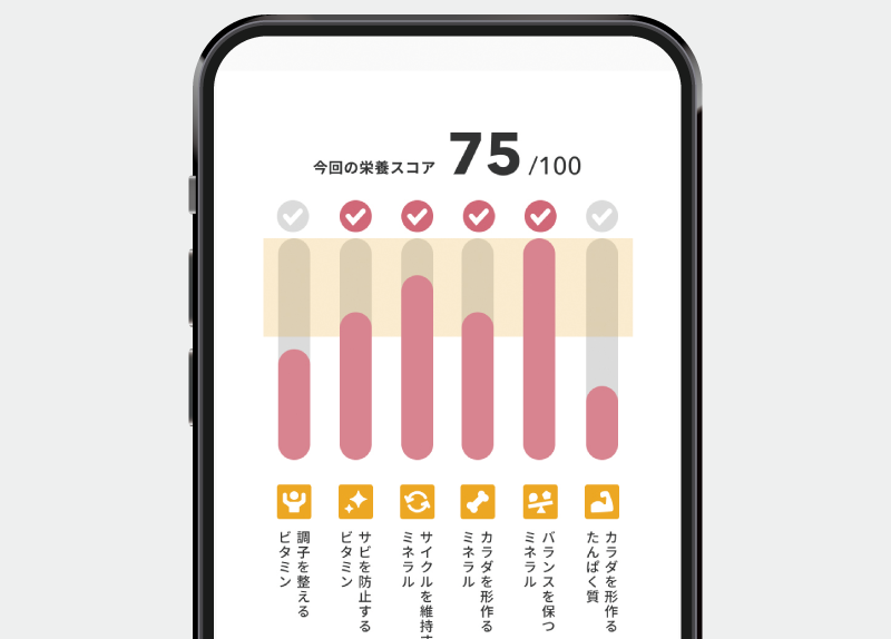 ビタミン・ミネラル・タンパク質の役割に基づき、6項目で栄養バランスを評価します。