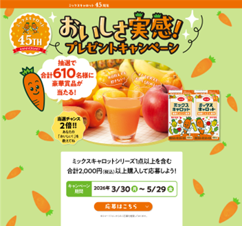 「ミッキャロ」の愛称で親しまれている「CO・OP ミックスキャロット」は、「子どもににんじんを摂ってもらいたい」という親の想いから1981年に生まれて以来、2026年で45周年を迎えます。これを記念して3月30日より「おいしさ実感!プレゼントキャンペーン」を開催します。
