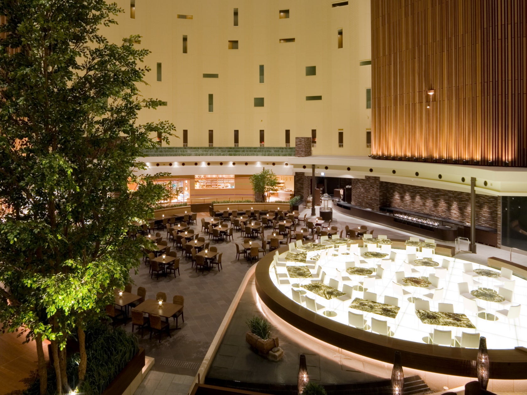 会場は、11層吹き抜けのアトリウムに位置するレストラン ファインテラス。自然と調和した雰囲気の中で、お子様から大人までご一緒にお楽しみいただけます。