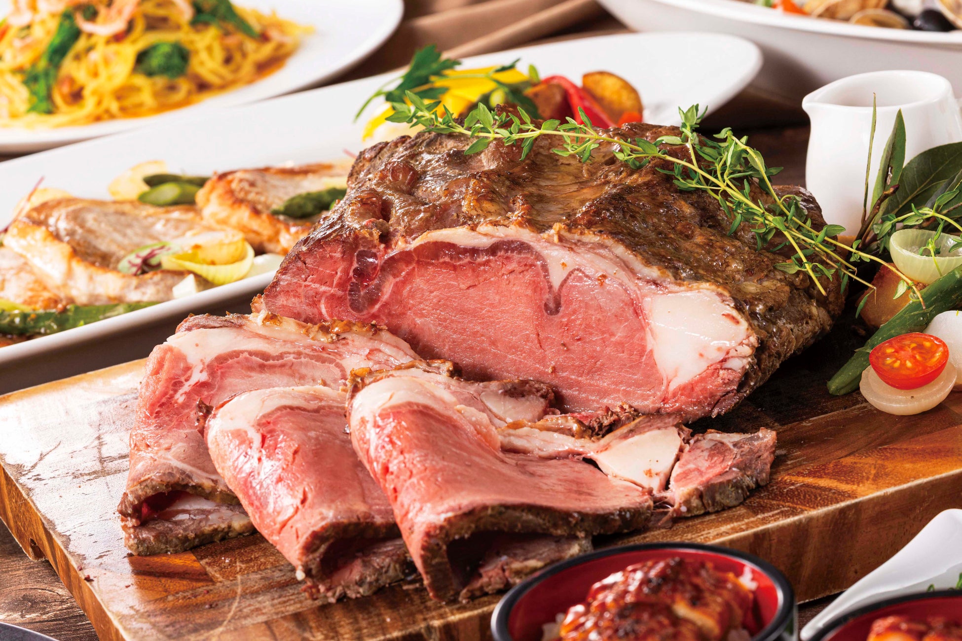 本ビュッフェの目玉は、スタッフがお客様の目の前で一枚ずつ丁寧に切り分ける「ローストビーフ」のカービング実演です 。しっとりと柔らかな肉質を、和風・おろしポン酢・ヨーグルトの3種の個性豊かなソースでお楽しみいただけます 。