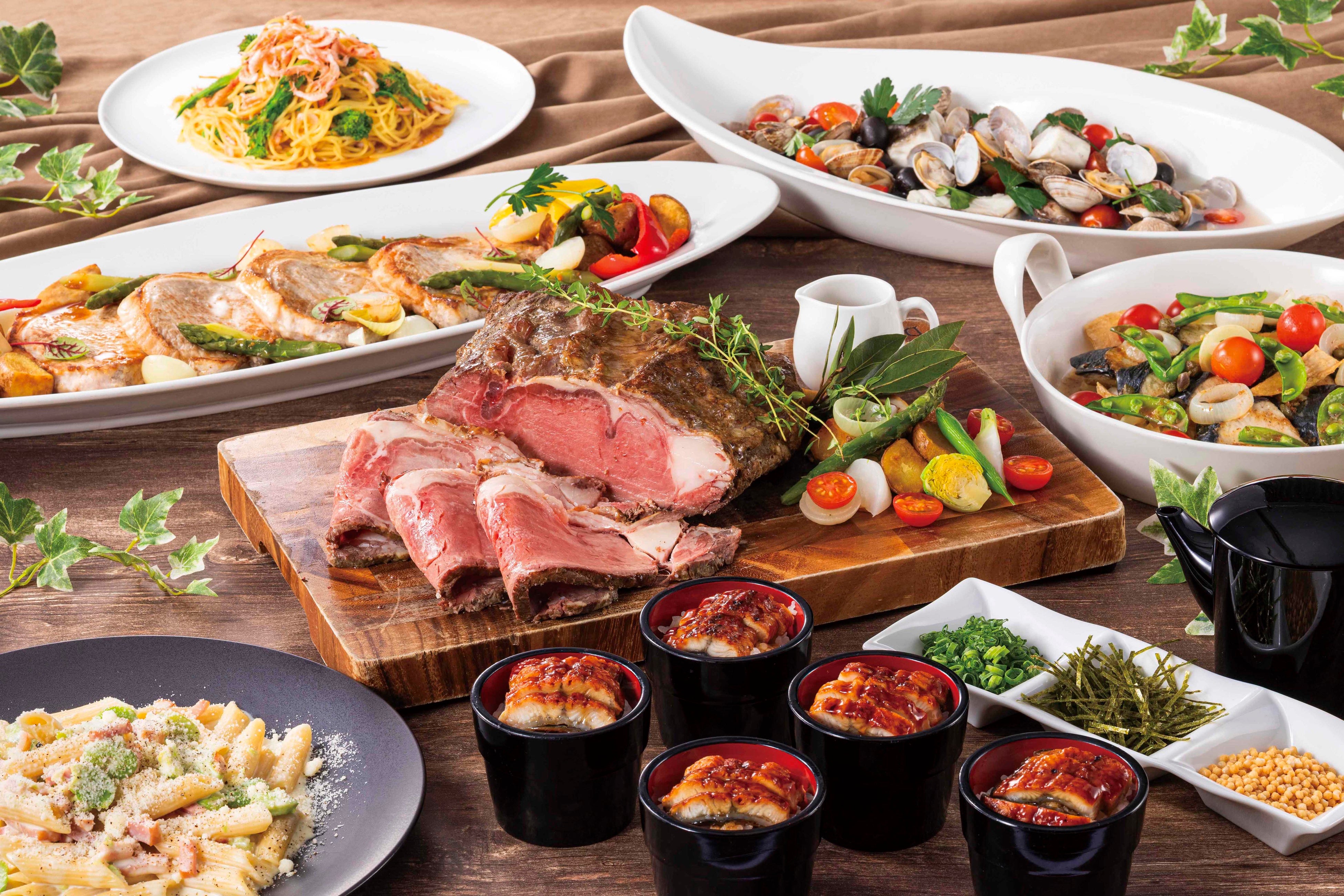 温製料理には「鰻のひつまぶし風」や、焦がしバターの香りが食欲をそそる「鰆とタケノコのオーブン焼き」、芳醇なトリュフが香る「豚肉のソテー」など、パワーチャージにぴったりの豪華メニューをラインアップ 。冷製メニューでは「生ハムとマンゴーのオードブル」や「シラスのフリッタータ」など、目にも鮮やかな初夏の旬食材がテーブルを彩ります 。