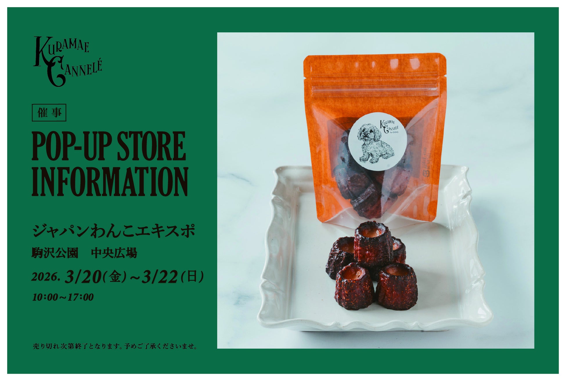 東京・蔵前にあるSNSで話題の焼きたてカヌレ専門店「KURAMAE CANNELÉ(クラマエカヌレ)」(運営:CLASSIC INC.、代表取締役 : 萱場俊克、本社 : 東京都渋谷区)は、2026年3月20日(金)〜3月22日(日)の期間、駒沢公園中央広場で開催されるイベント「ジャパンわんこエキスポ」にて、愛犬用クラマエカヌレを販売いたします。