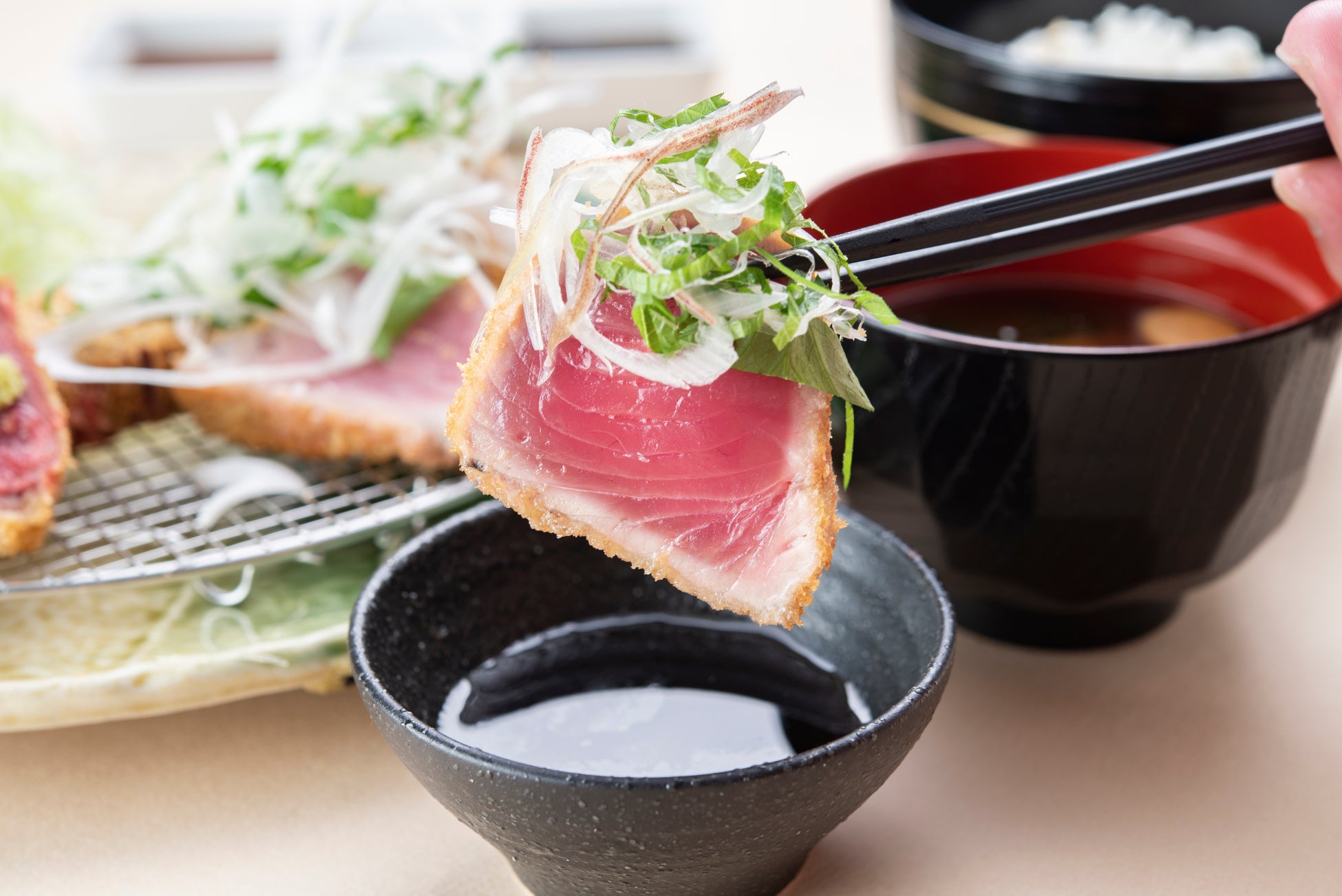 京都勝牛こだわりの牛カツと同様、高品質な素材に薄衣をまぶし、高温短時間で外はサクッと、中はしっとりレアに仕上げます。レアに仕上げた鰹カツは臭みがなく、鰹本来の味わいともっちりとした食感と濃厚な味わいをお楽しみいただけます。