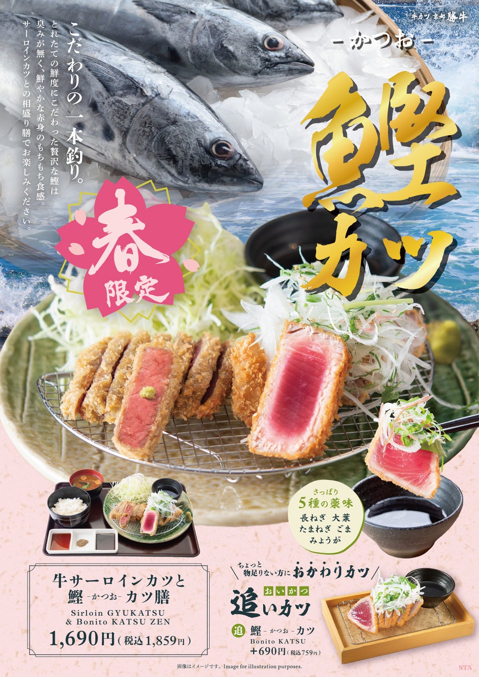 株式会社京都勝牛(本社:京都府京都市)が展開する「牛カツ京都勝牛」は、季節メニューとして毎回人気の“肉と海鮮の相盛り膳”シリーズから、春季限定「牛サーロインカツと鰹(かつお)カツ膳」 を2026年3月17日(火)より全国の店舗にて期間限定で販売開始いたします。