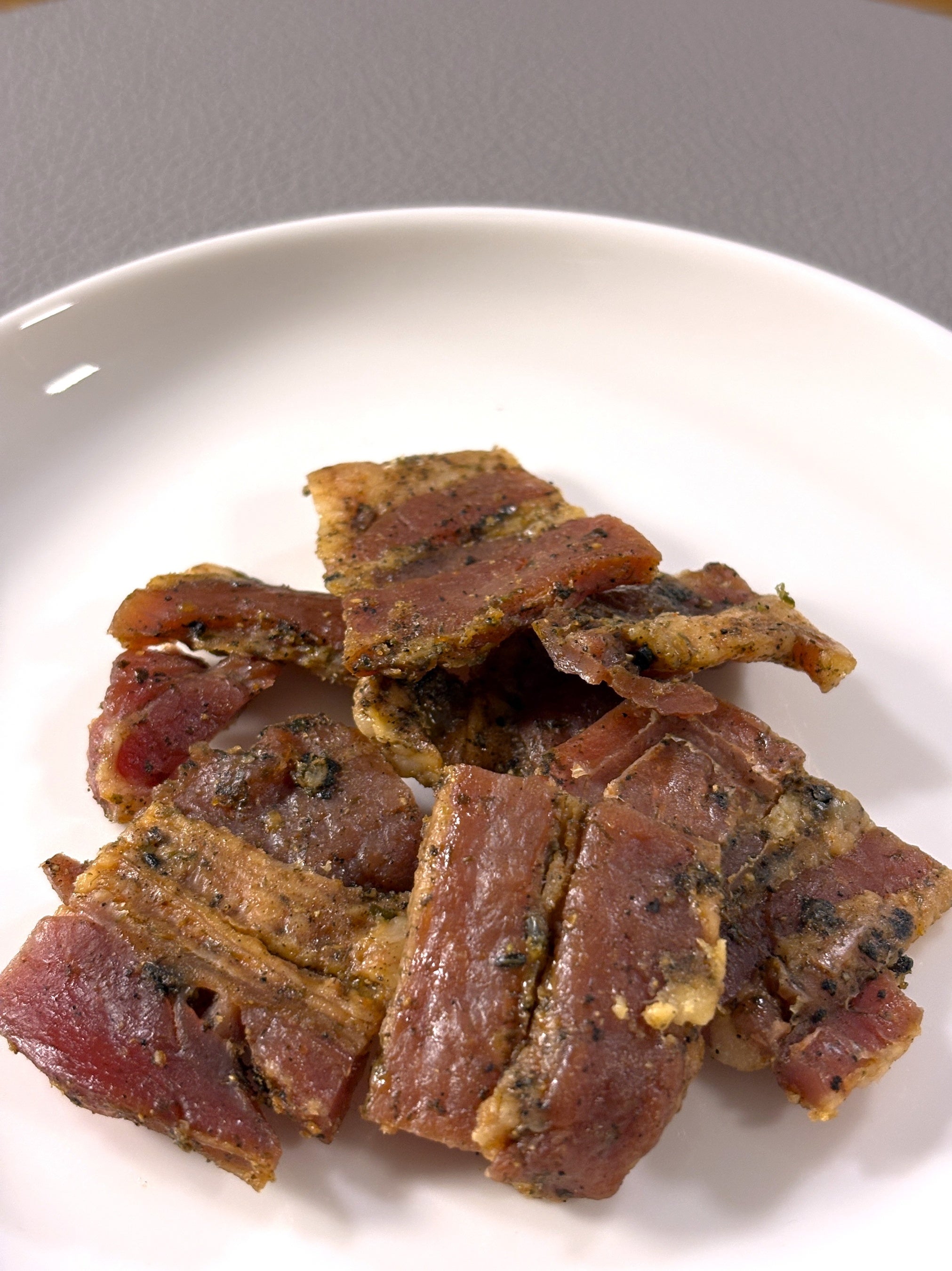 丁寧に仕込んだ厚切り豚バラジャーキーに、京都・七味家本舗の七味が出会いました。
