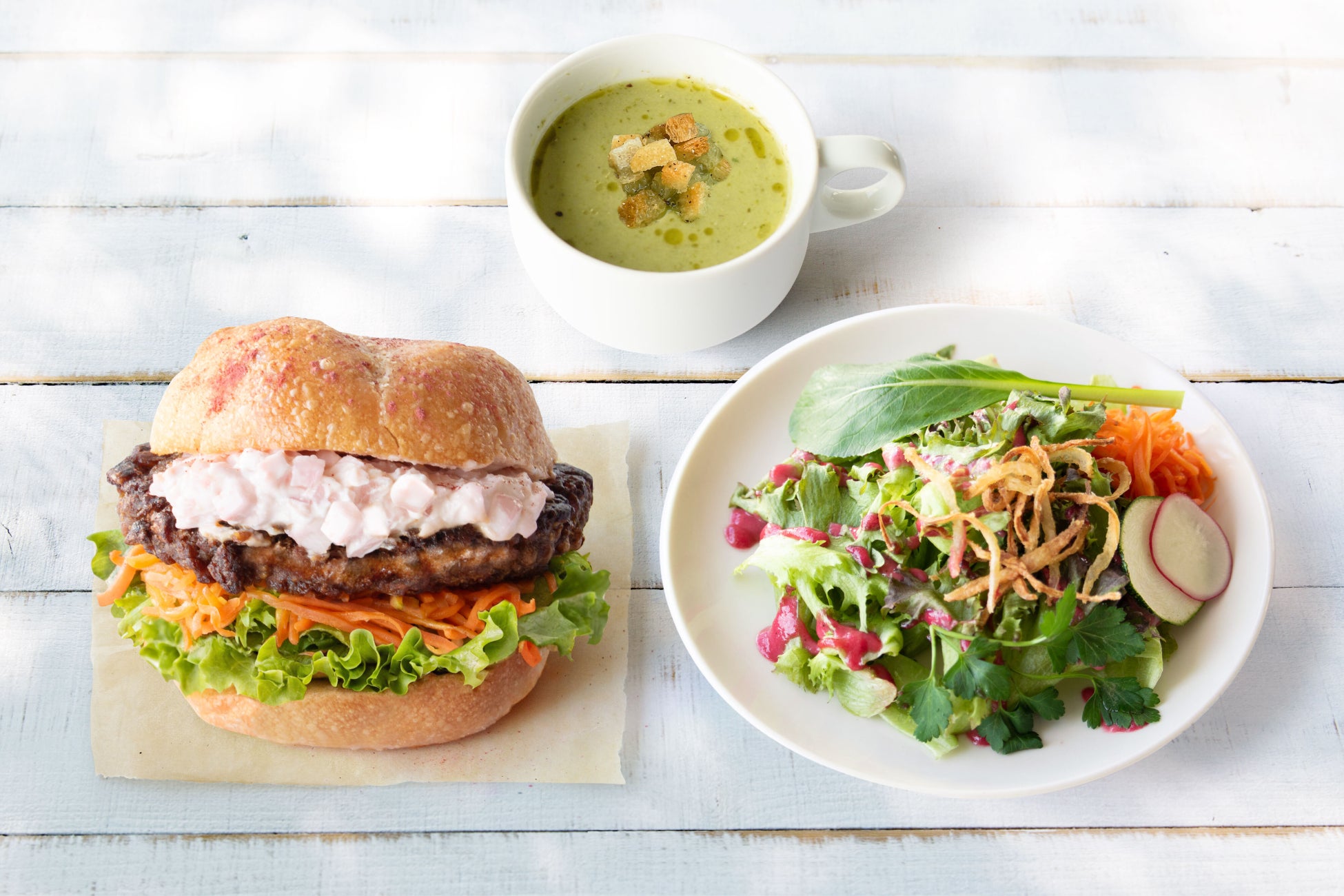人気のプラントベース・ハンバーグをバーガーとして再構成。ビーツで色付けしたサクラ色のお豆腐のタルタルソースとなめらかなじゃがいもペーストが、甘辛いてりやきパティとフレッシュな野菜をやさしくつなぎます。春の畑をそのまま挟んだような華やかさと満足感を両立した季節限定バーガーです。