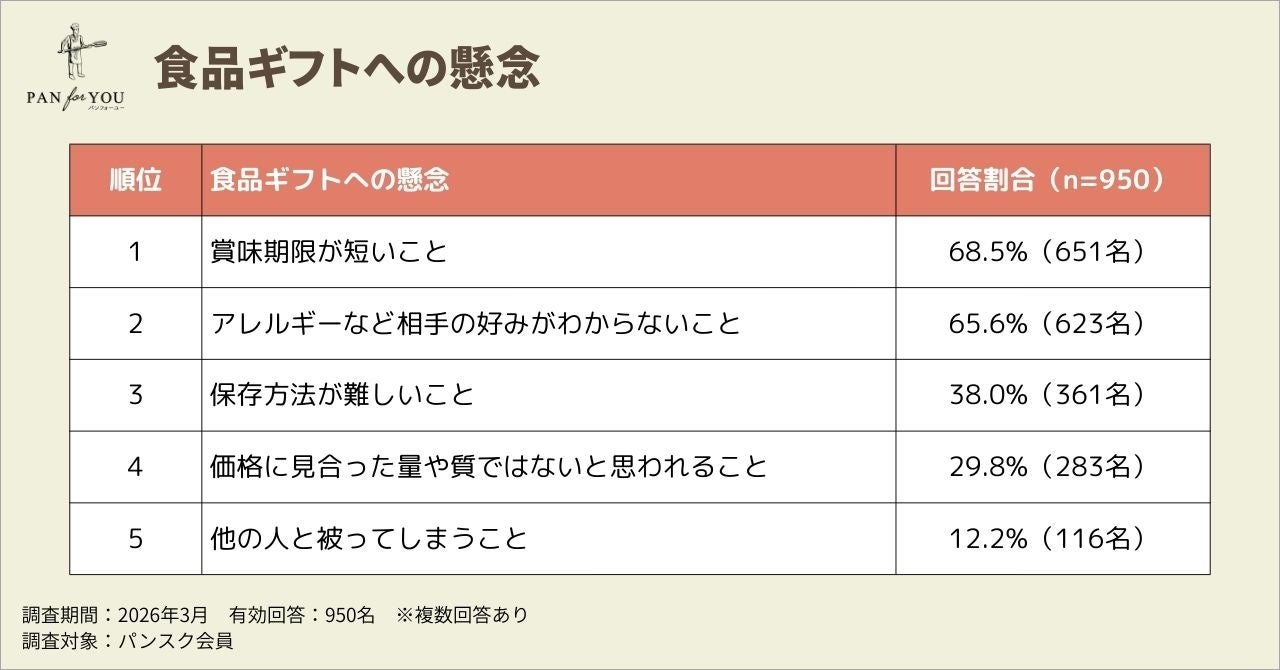 歓送迎会ギフトとして食品を選ぶ際の懸念として、「賞味期限が短いこと」が68.5%(651名/950名)で最多となり、次いで「アレルギーなど相手の好みがわからないこと」が65.6%(623名/950名)で僅差の2位でした。この2大障壁が、食品ギフトを選ぶうえでの根強い課題として浮き彫りになりました。