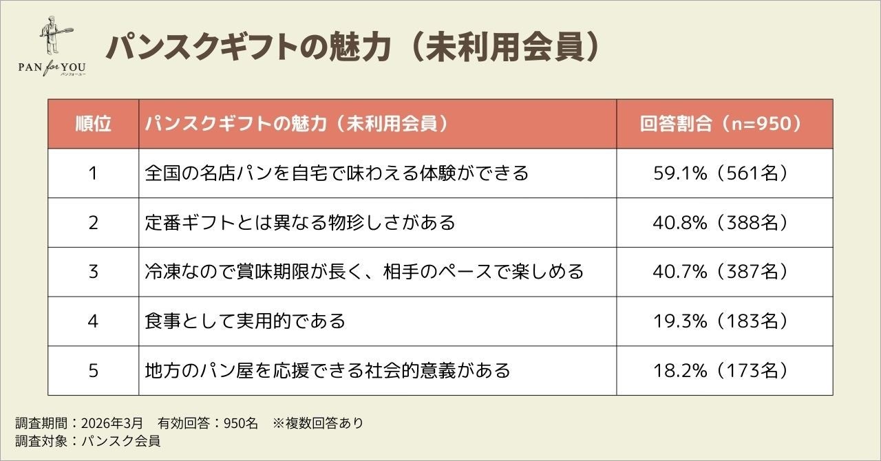 パンスクギフトを利用したことがないパンスク会員950名に対し、「全国各地のパン屋から冷凍パンが届くギフト」としてパンスクギフトを紹介したところ、「とても興味がある」(29.6%)と「やや興味がある」(41.4%)を合わせた70.9%(674名)が肯定的な反応を示しました。また、最も魅力を感じる点として「全国の名店パンを自宅で味わえる体験ができる」(59.1%)が首位となり、体験型消費へのニーズの高さが確認されました。