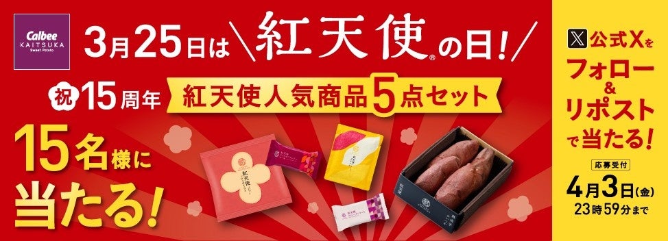 カルビーかいつかスイートポテト株式会社(本社:茨城県かすみがうら市、代表取締役社長:安藤 國行)は、2026年3月25日(水)に自社のオリジナルブランドさつまいも『紅天使(べにてんし)』が商標登録から15周年を迎えることを記念し、公式Xにて紅天使の人気商品詰め合わせが当たるプレゼントキャンペーンを実施いたします。応募期間は、2026年3月25日(水)から4月3日(金)までです。