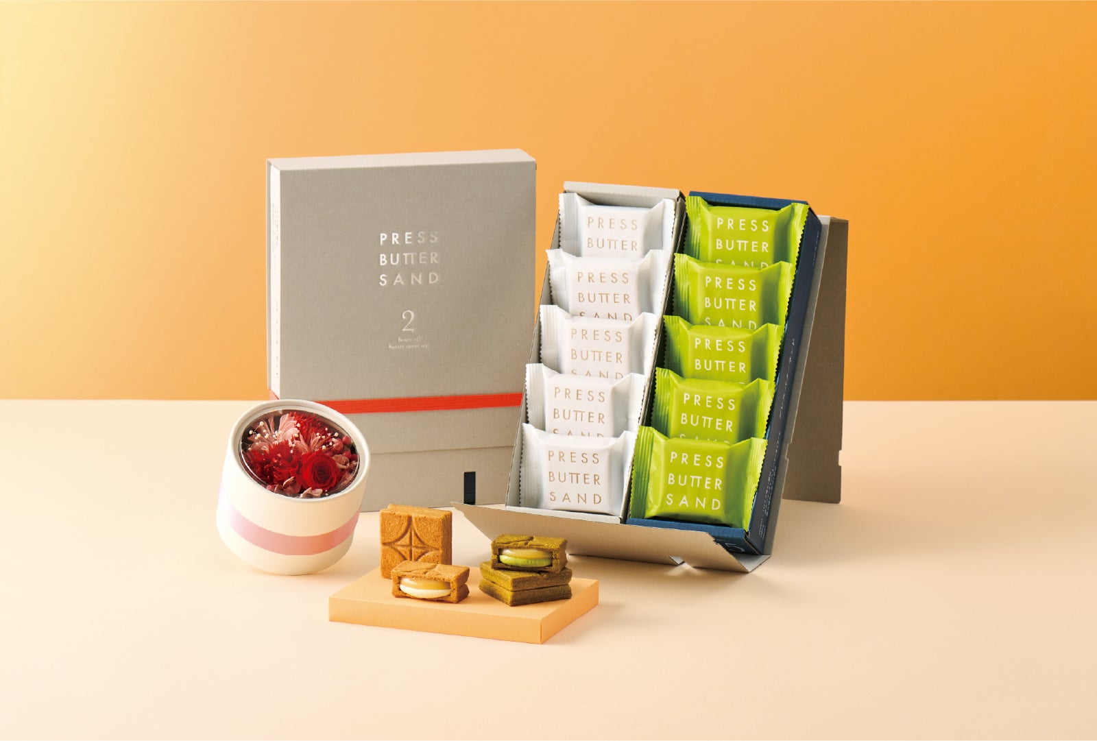 ● バターサンド2種セット贈り物〈宇治抹茶〉10個入&ドームフラワーボックス