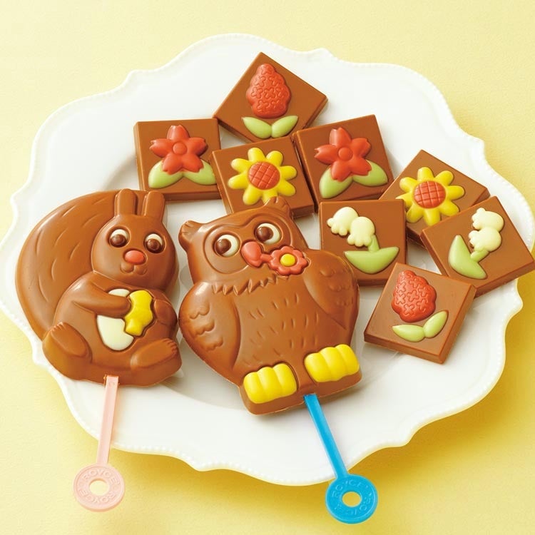 北海道・新千歳空港にあるロイズ チョコレートワールドで人気の、フクロウとリスのロイズポップチョコと、色とりどりのロイズフラワーチョコを、動物たちが描かれたかわいらしいパッケージに詰め合わせました。