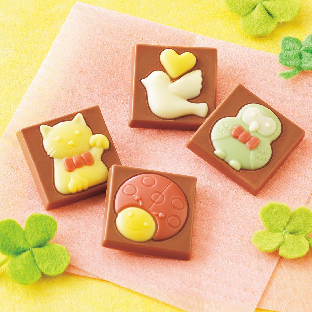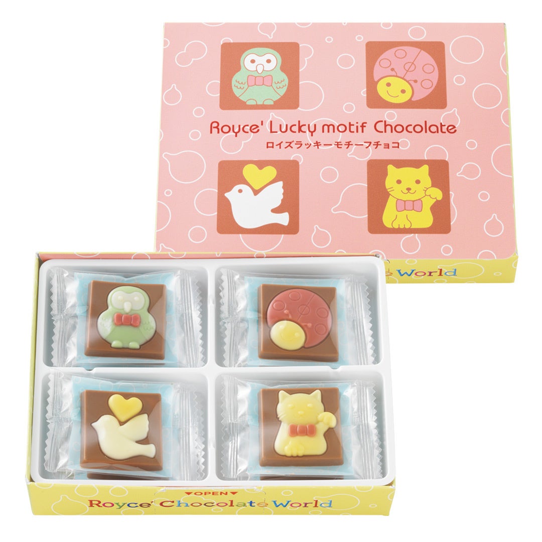 幸運の象徴とされる4つの生き物やアイテムをモチーフにしたひと口サイズのチョコレート。ストロベリー風味のクリームをまろやかなミルクチョコレートで包み、フクロウ・てんとうむし・ハト・招き猫の4種をデザインしました。通常は新千歳空港3階のロイズ チョコレートワールド限定販売ですが、期間限定で公式オンラインショップでも販売します。